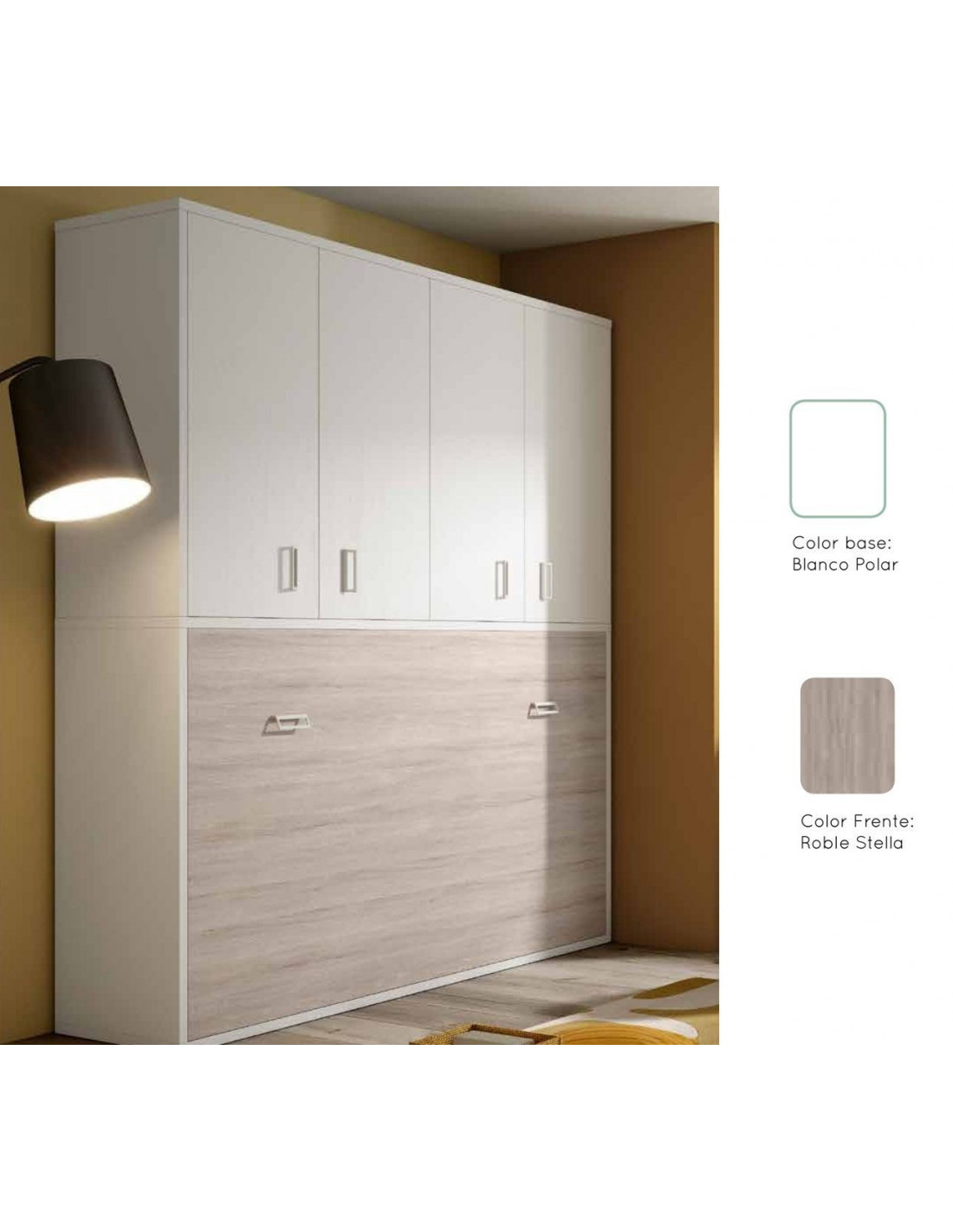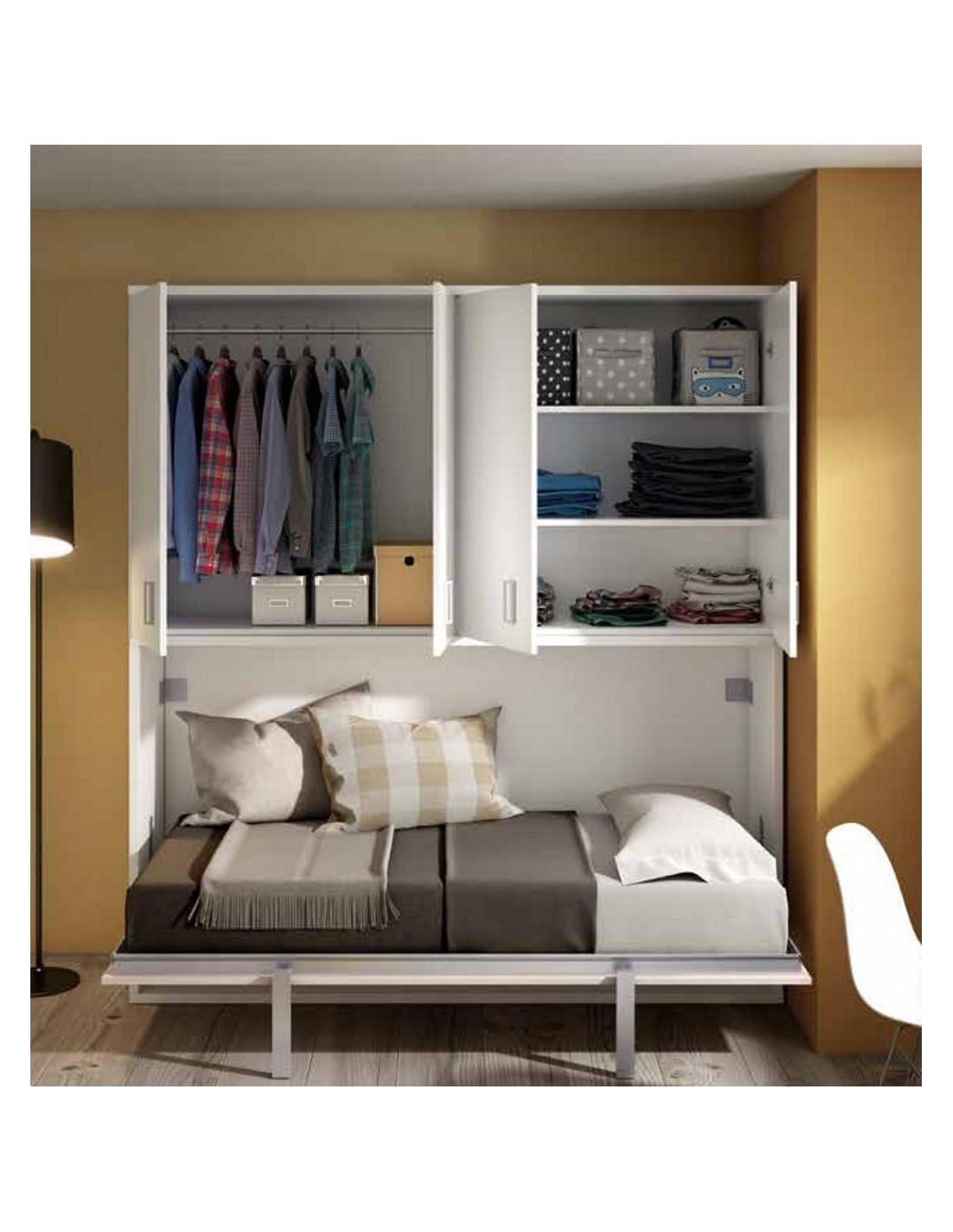 Cama abatible de 90x190 cm. con armario de puertas abatibles con barra para colgar y estantes