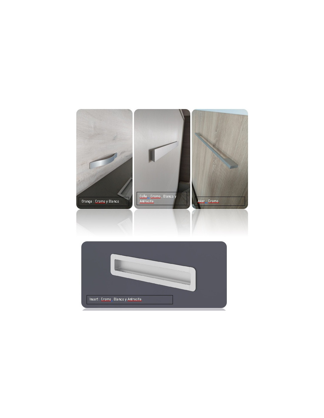 - Colores base: aplicables al cajón exterior, son los colores blanco - olivo - antracita - cerezo - roble - wengué - chocolate - vison - fresno - glacial - vintage - cemento - cambrian - ébano.