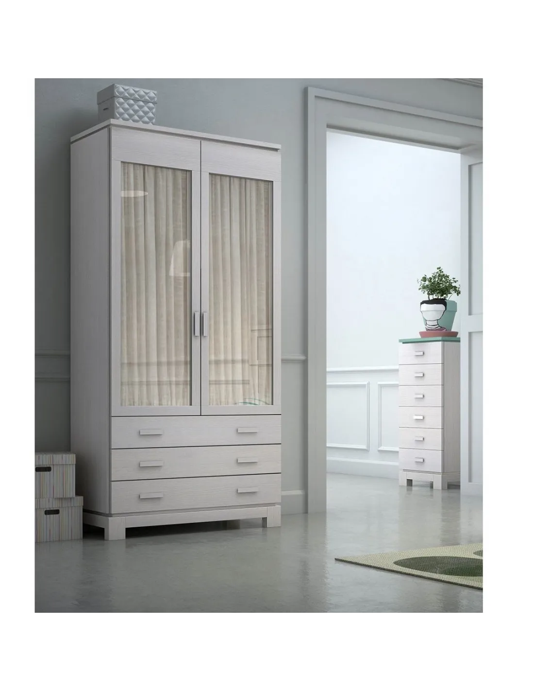 Este armario moderno de dos puertas batientes se fabrica usando madera maciza de pino, y viene con las siguientes medidas: