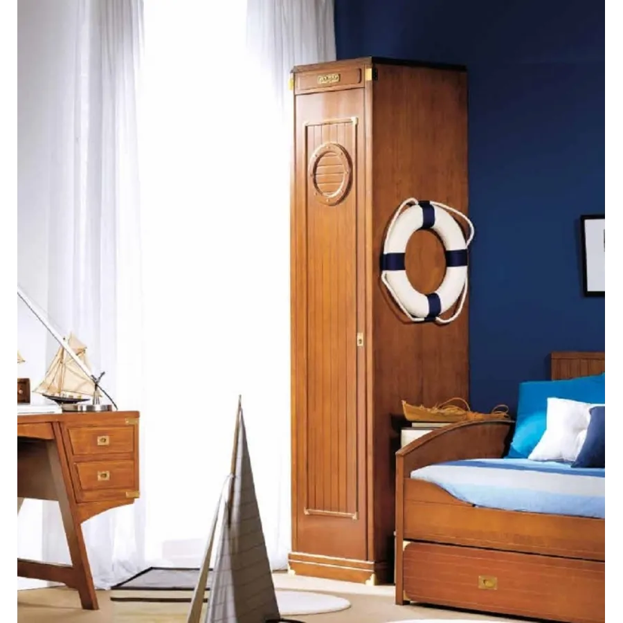 Este armario de una puerta tiene unos acabados pulimentados y barnizados de primera calidad, con la posibilidad de elegir entre blanco decapado, nogal claro y nogal naútico, con los detalles del mueble y herrajes de latón pulido.