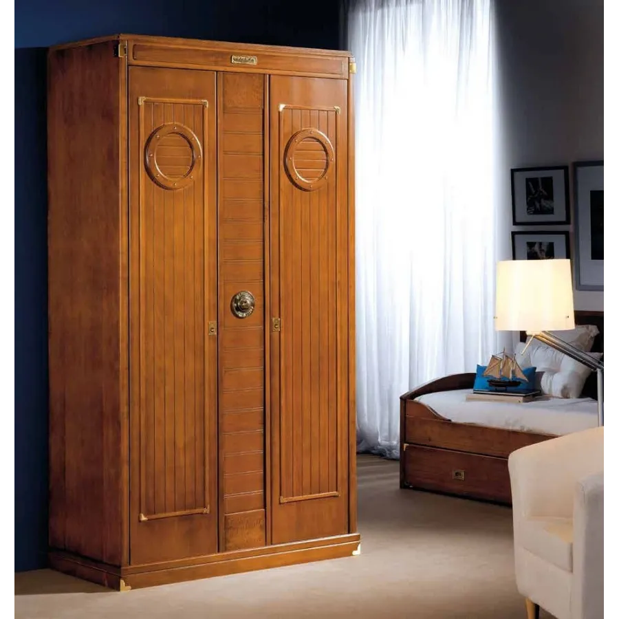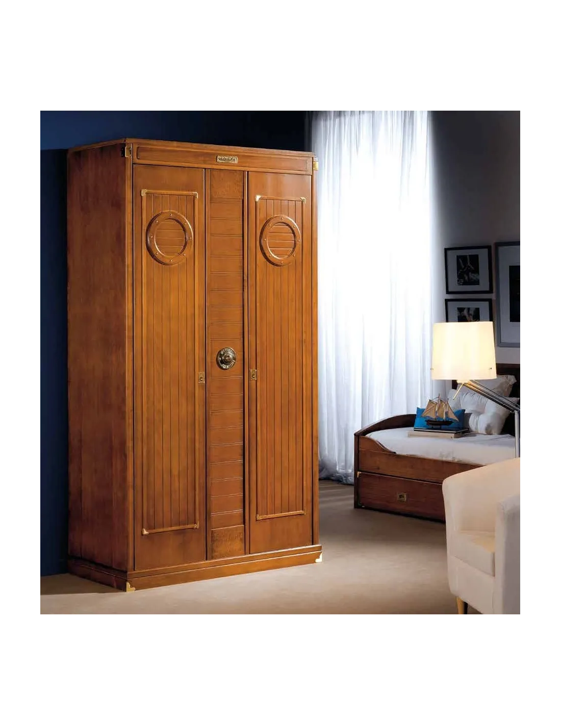 Este armario de dos puertas ancho tiene unos acabados pulimentados y barnizados de primera calidad, con la posibilidad de elegir entre blanco decapado, nogal claro y nogal naútico, con los detalles del mueble y herrajes de latón pulido.