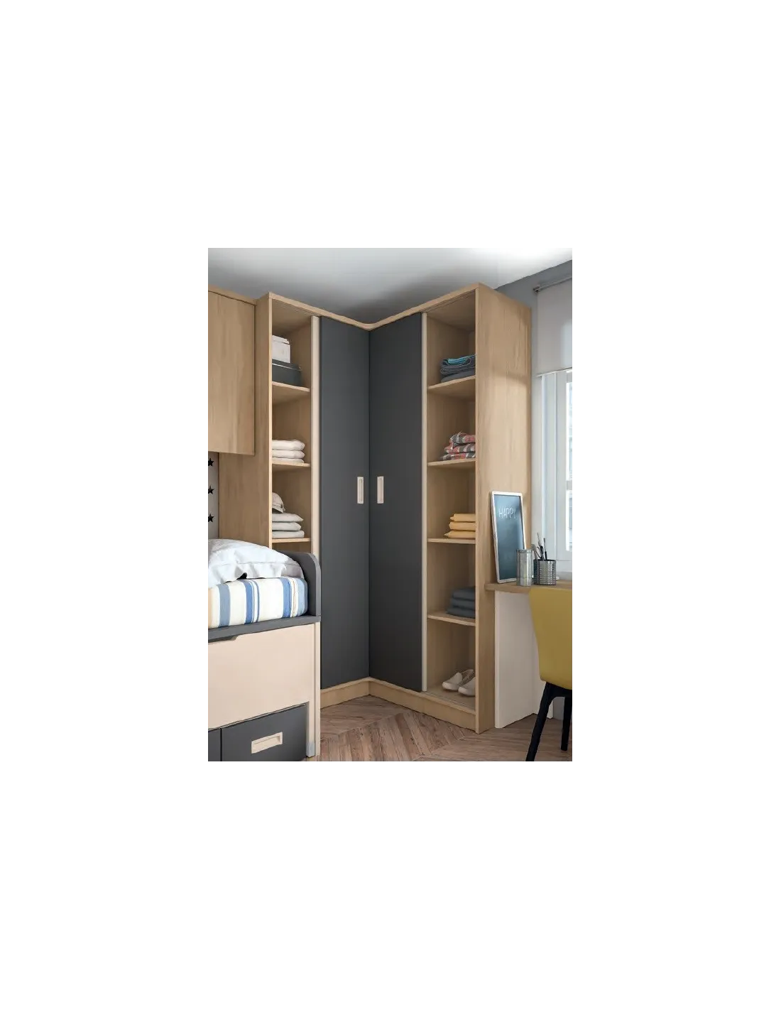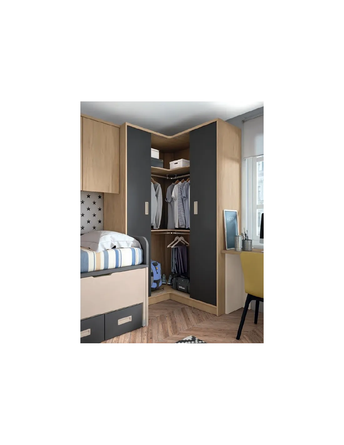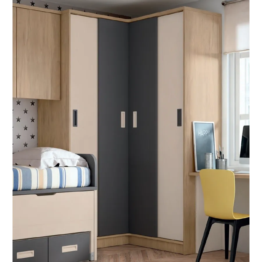 Armario de rincón con puertas corredera de fabricación española hecha en melamina de primera calidad con tablero melamínico de primera calidad resistente a ralladuras y manchas, según normativa vigente. Tablero de 19 y 30 mm. de grosor canteado en PVC de 1 mm. de grosor y herrajes de primera calidad.