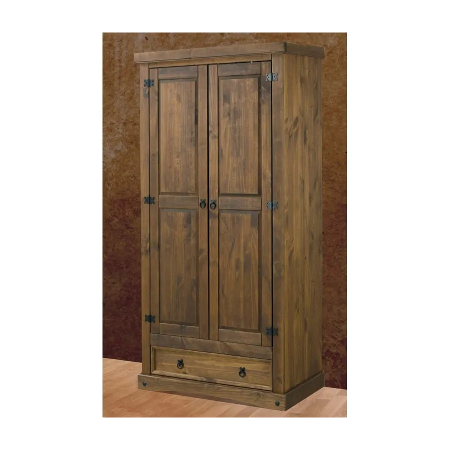 Este armario colonial de madera tiene un diseño inspirado en los muebles de estilo rústico. Fabricado en madera maciza de pino con acabado a la cera de color oscuro. Combinada con herrajes y tiradores de forja negra.