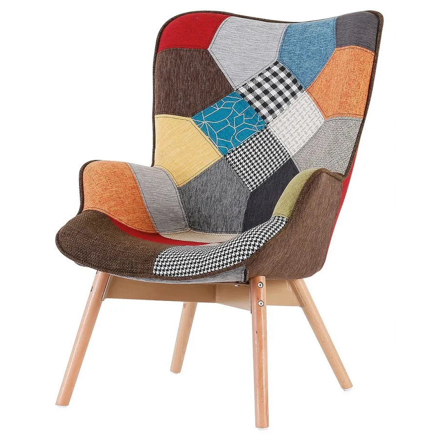 Elegante sillón nórdico tapizado en tejido Patchwork, con la base de patas de madera de haya natural, duradera y resistente.
