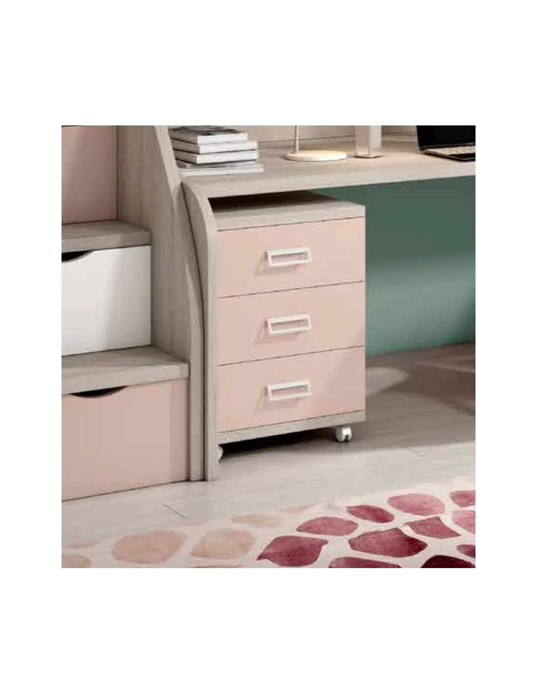 Serie de muebles juveniles de diseño moderno con la mejor relación calidad-precio. Estos muebles de dormitorio juvenil destacan por sus materiales, usando tableros de 30mm con canteados de pvc hidrófugos de primera calidad, y sus acabados disponibles, con colores de última moda como el azul city o el rosa nube.