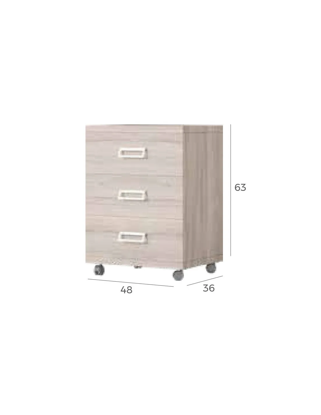 Este mesita con tres ccajones de guía metálica y ruedas tiene estas medidas: