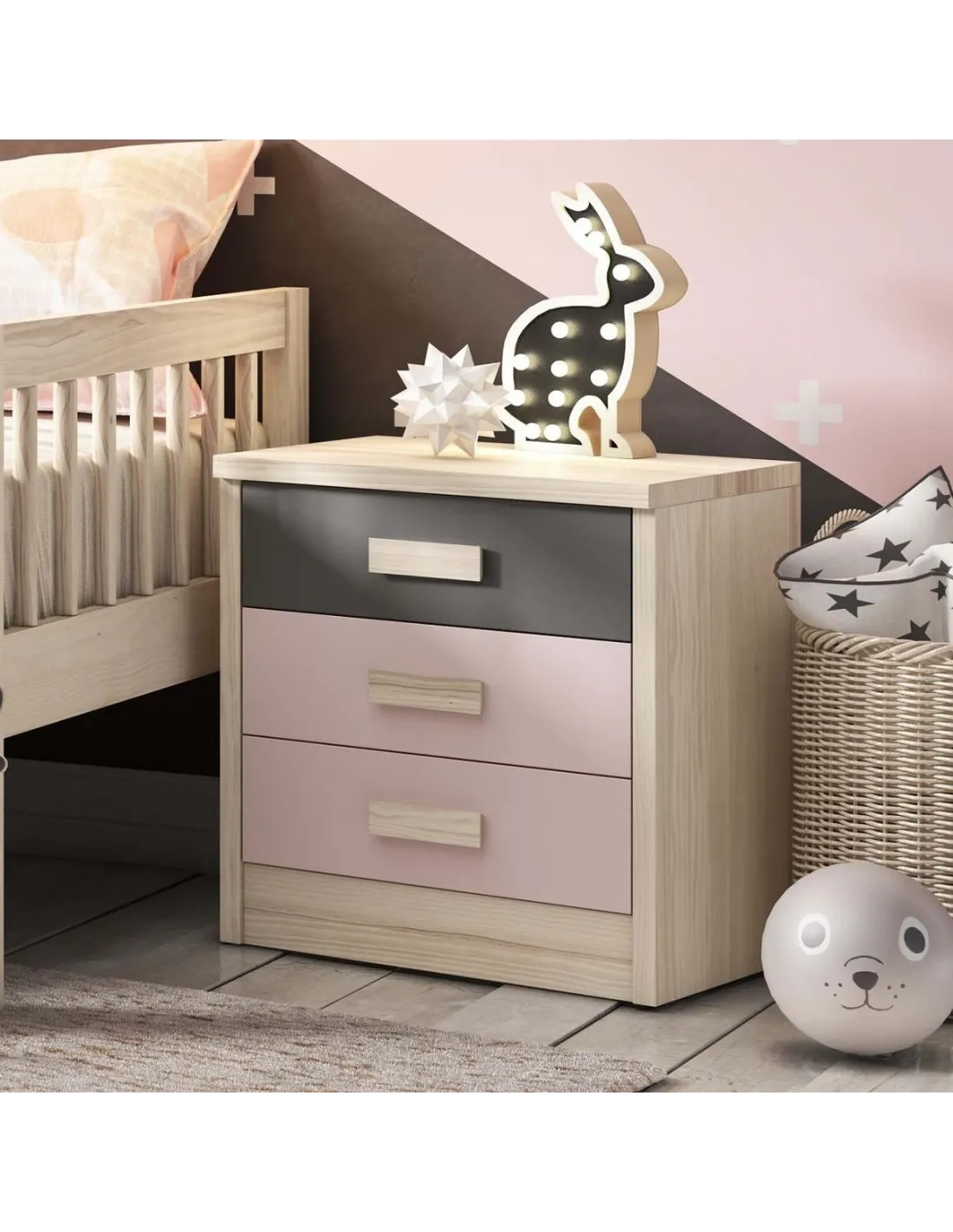 Esta mesita de noche moderna madera 3C está disponible con tres cajones de guía metálica de deslizamiento suave y gran capacidad de almacenaje, con las siguientes medidas totales en cm.: