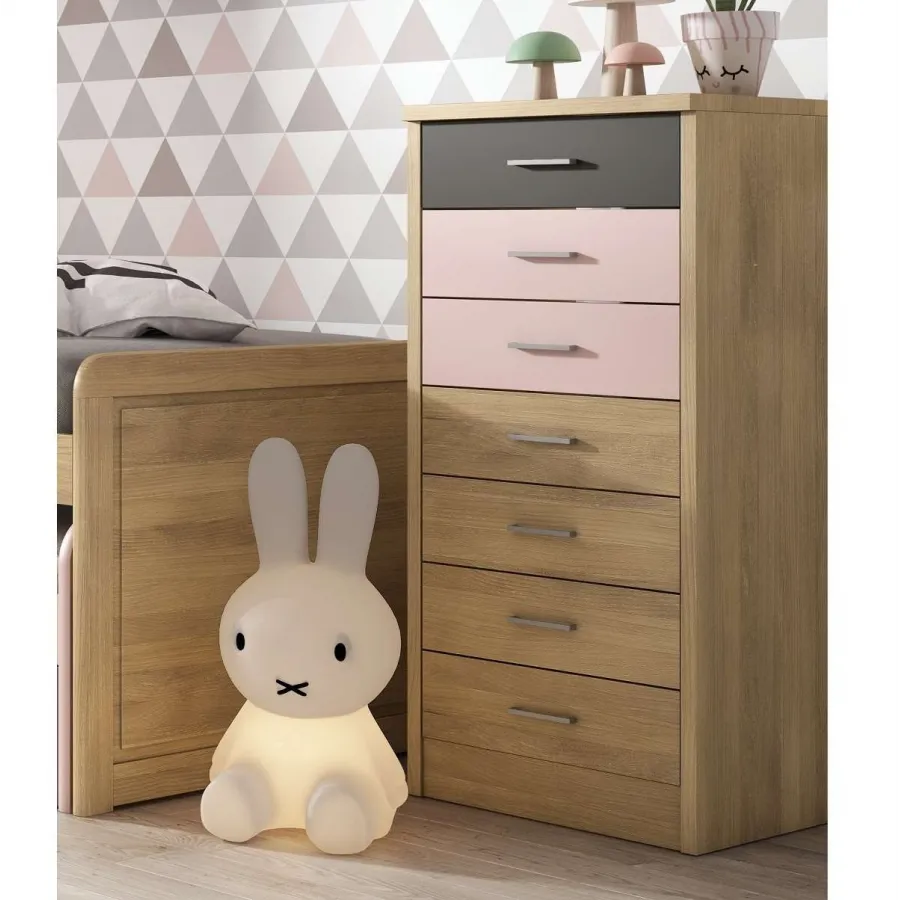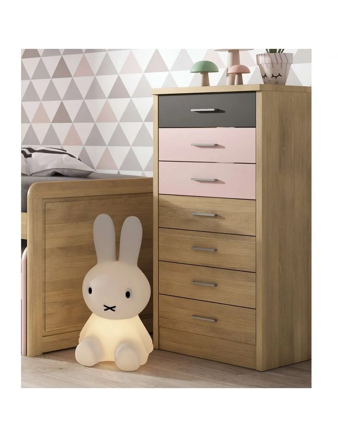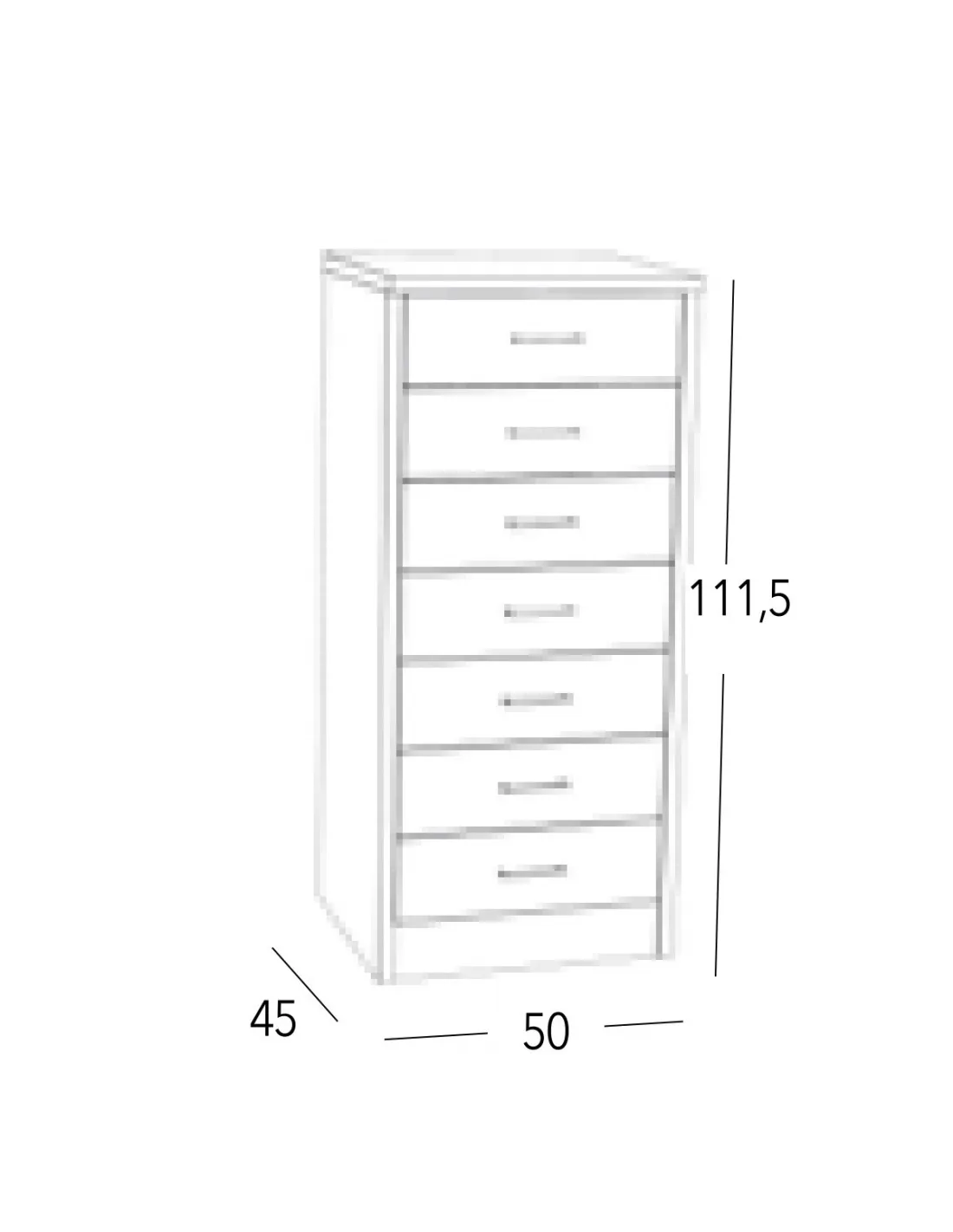 El sinfonier 50 madera maciza 7C está disponible con siete cajones de guía metálica de deslizamiento suave con gran capacidad de almacenaje y tiradores a elegir. Presenta las siguientes medidas totales en cm.: