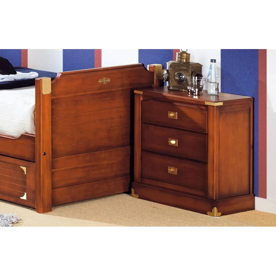 Esta mesita de noche colonial tres cajones tiene unos acabados pulimentados y barnizados de primera calidad, con la posibilidad de elegir entre blanco decapado, nogal claro y nogal naútico, con los detalles del mueble y herrajes de latón pulido.