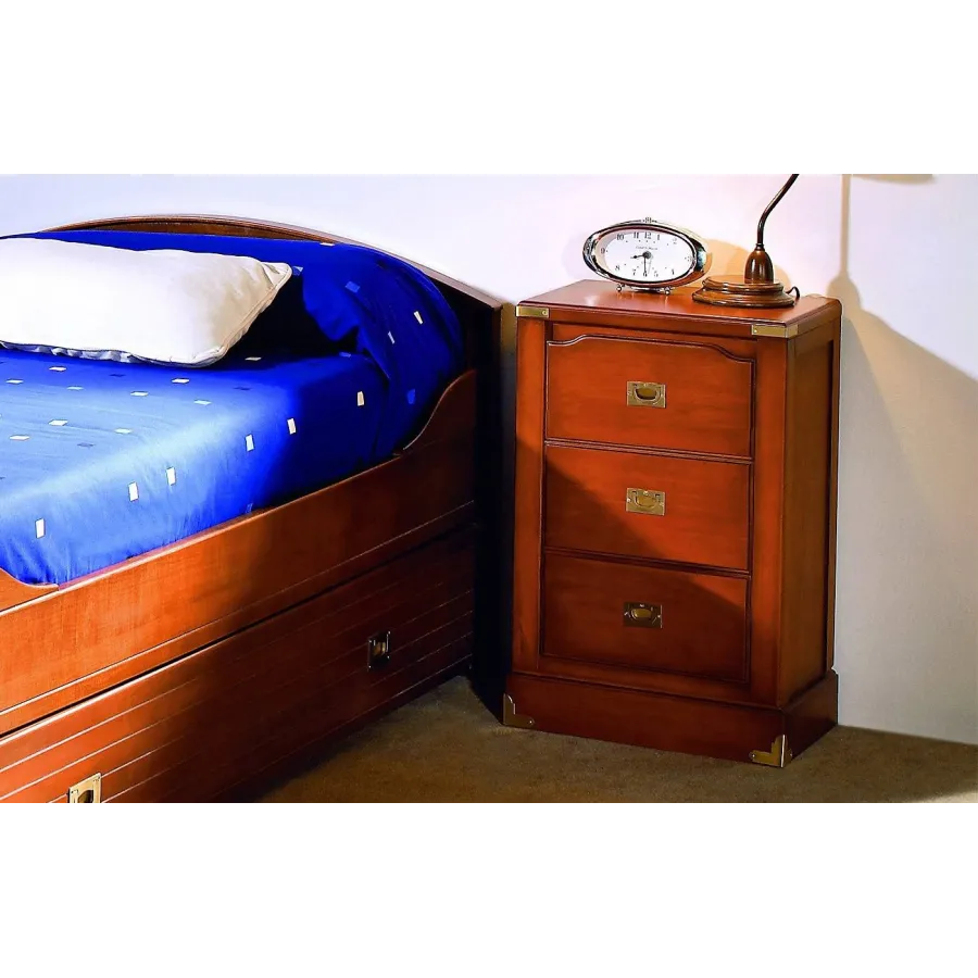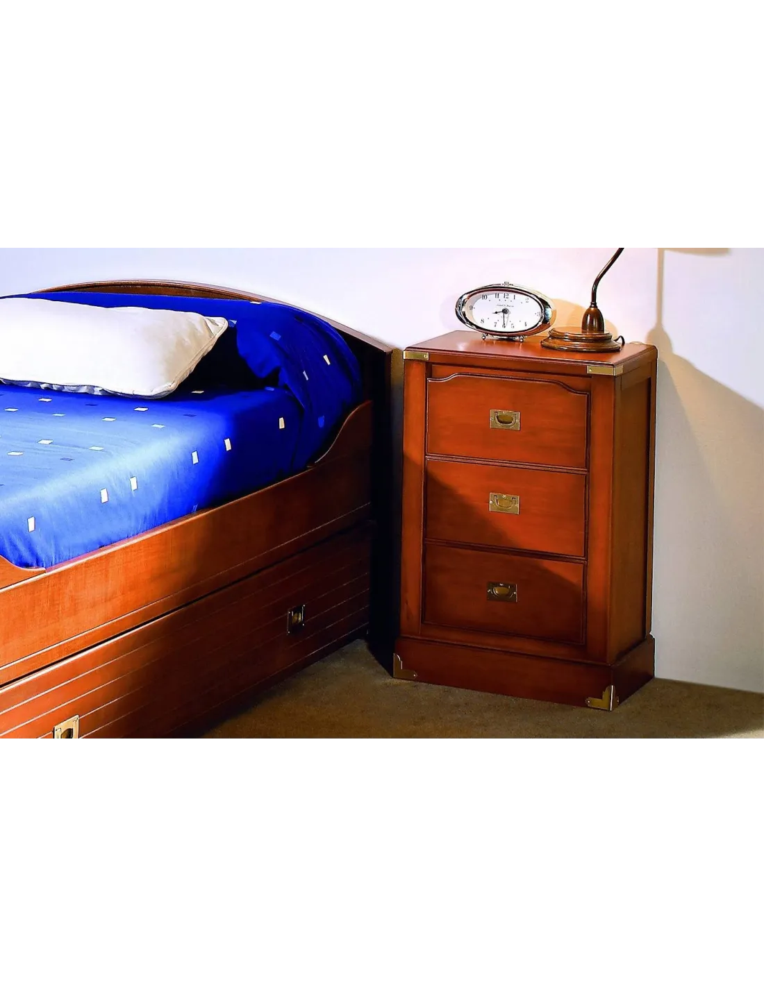 Esta mesita de noche colonial 45 tres cajones tiene unos acabados pulimentados y barnizados de primera calidad, con la posibilidad de elegir entre blanco decapado, nogal claro y nogal naútico, con los detalles del mueble y herrajes de latón pulido.