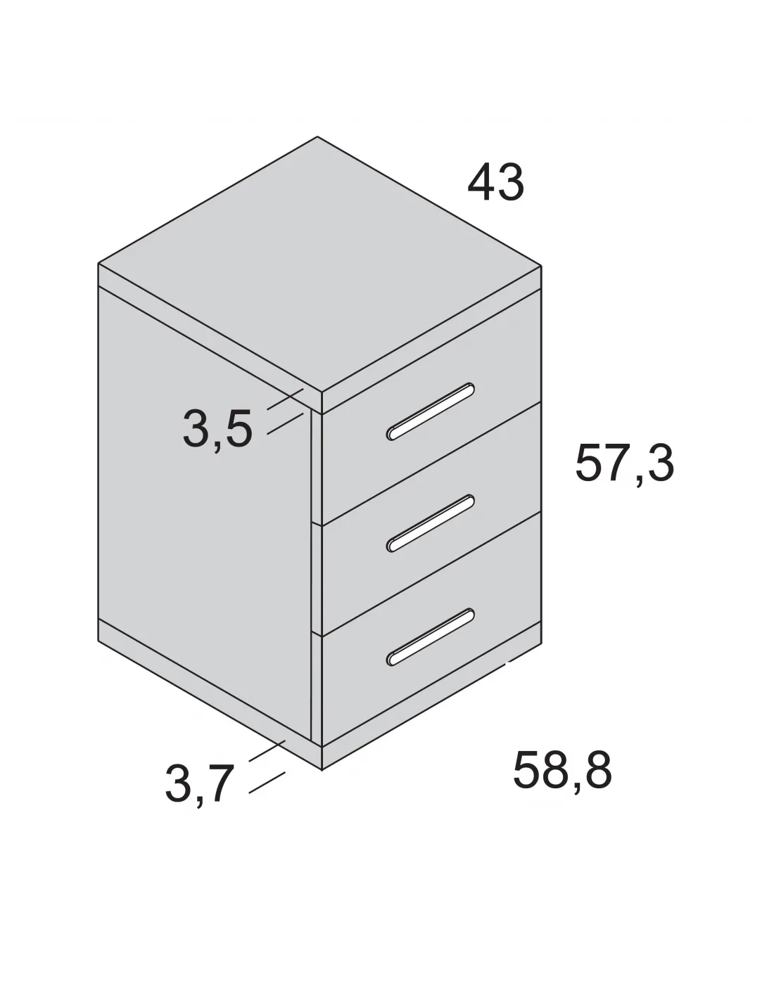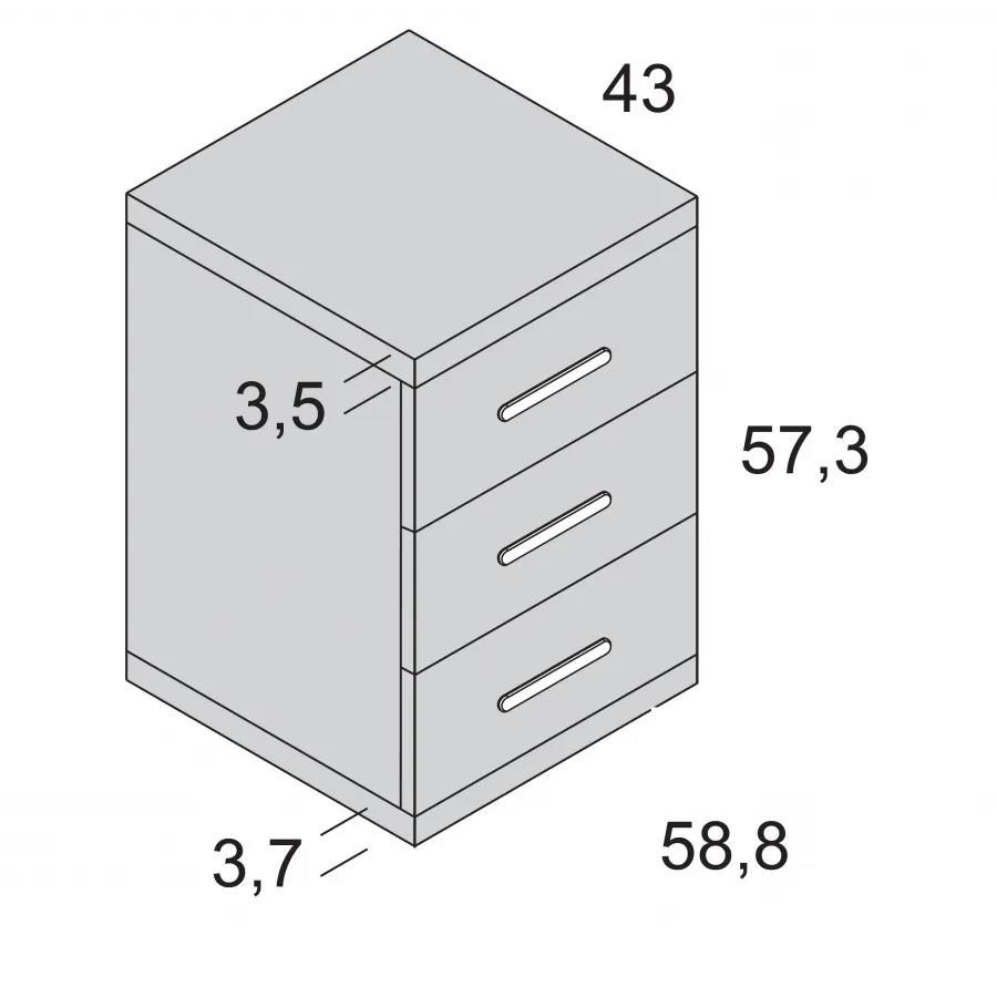 Esta mesita noche 3 cajones y 58 cm. viene con cajones de cierre amortiguado y tiene las siguientes medidas totales: