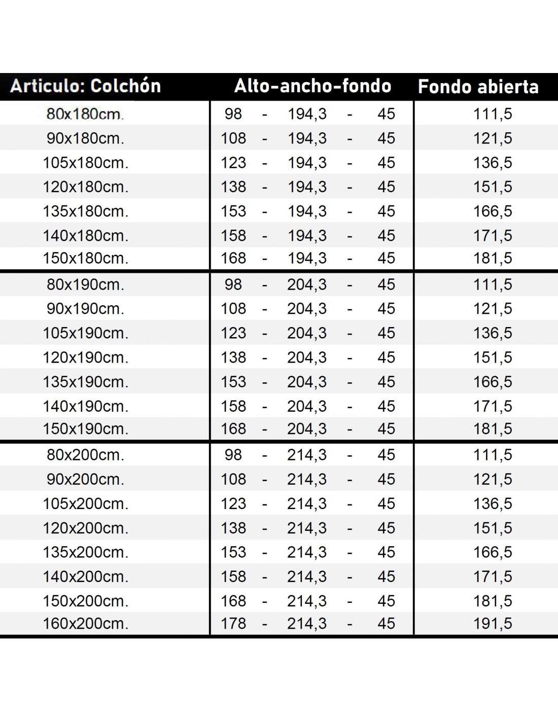 - Ancho: 194,3 / 204,3 / 214,3 cm. (para colchones de largo 180 / 190 / 200 cm.)