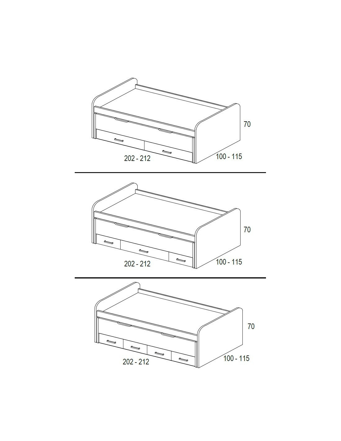 Esta cama compacta base 20 con frontal alto y cajones de guía metálica autocierre está disponible para colchones de 90 / 105 cm. de ancho y 180 / 190 / 200 cm. de largo. Tiene siguientes medidas totales en largo x alto x fondo (en cm.):