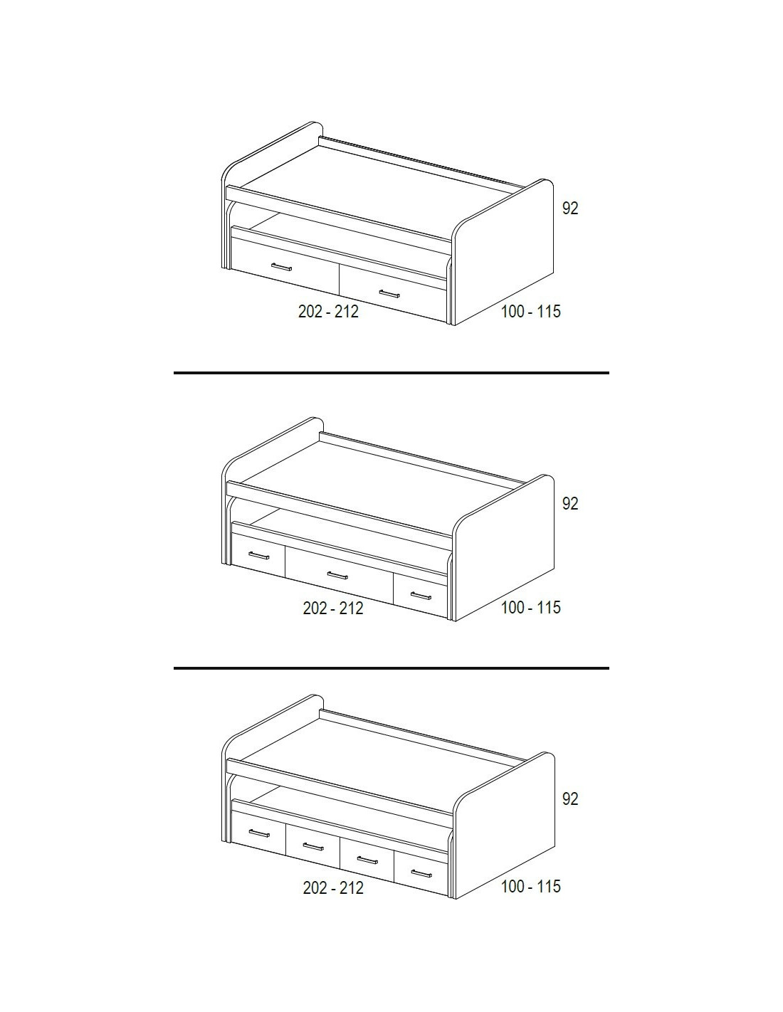 - Compacta: 202 / 212 (colchón 190 / 200) x 100 / 115 (colchón 90 / 105) x 92 (altura base cama superior 69 cm. aproximadamente)