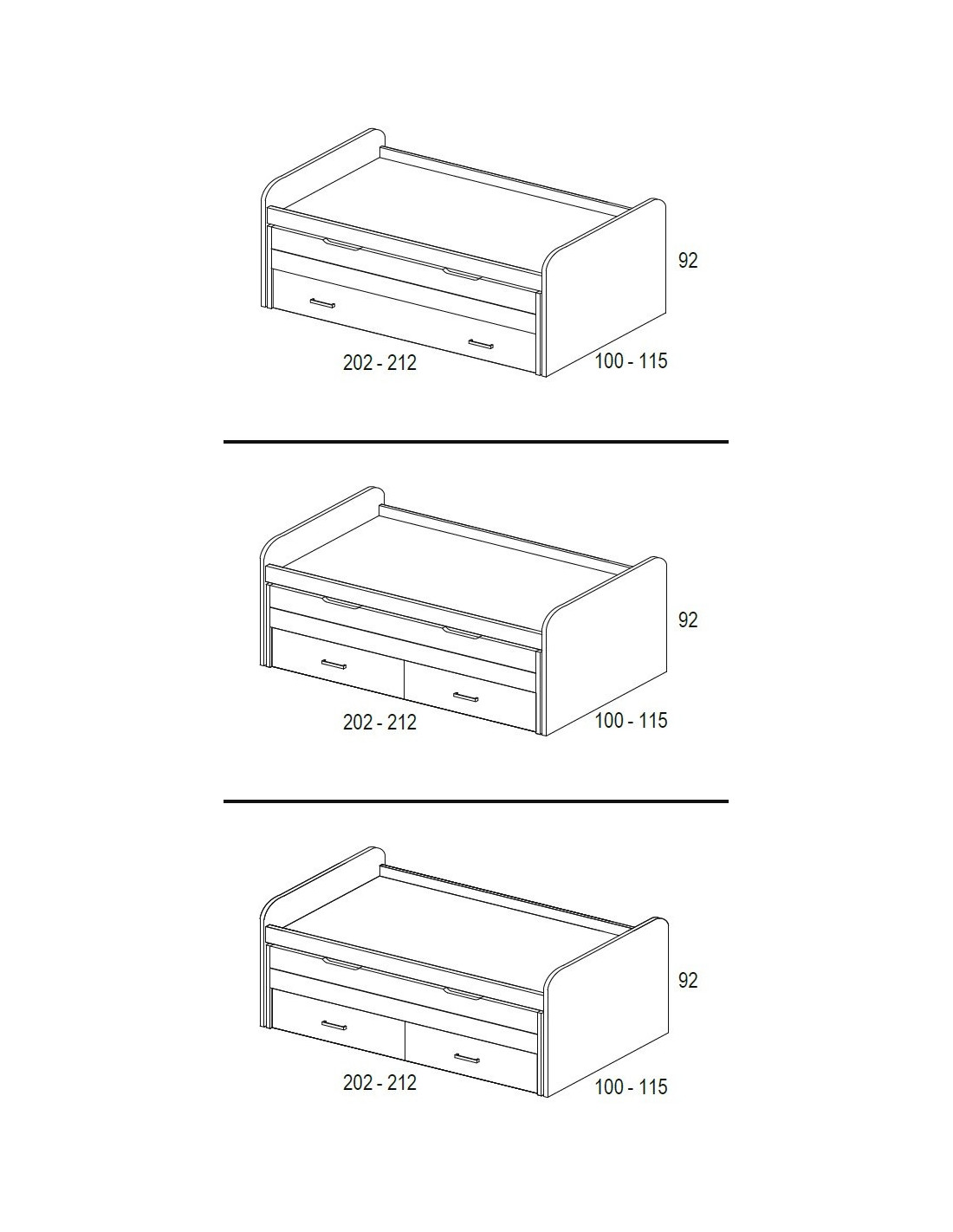 - Compacta: 202 / 212 (colchón 190 / 200) x 100 / 115 (colchón 90 / 105) x 92 (altura base cama superior 69 cm. aproximadamente)