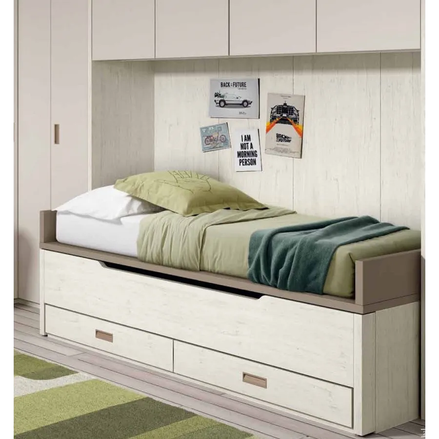Este compacto dos camas 90x190 frontal alto con dos cajones se compone de dos camas para colchón de 90x190 cm. con dos cajones de gran capacidad en su parte inferior, con sistemas de guías metálicas con sistemas de cierre automático amortiguado. Sobre este compacto se dispone la trasera y los brazos que hacen de sostén del colchón.