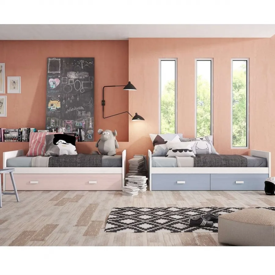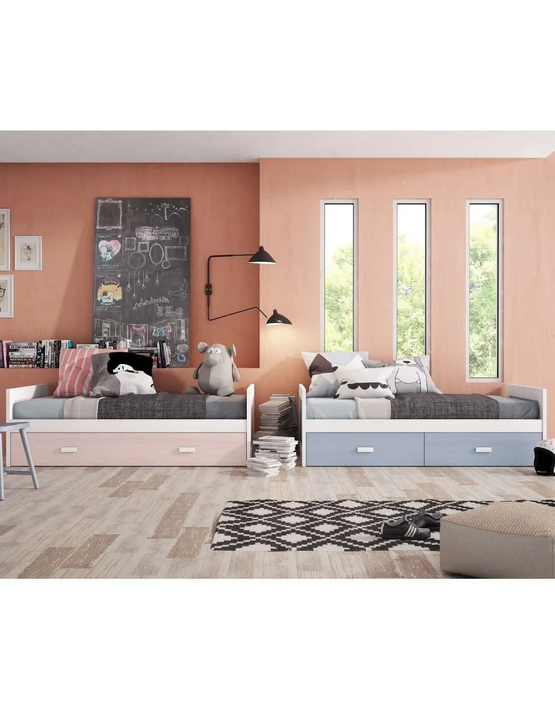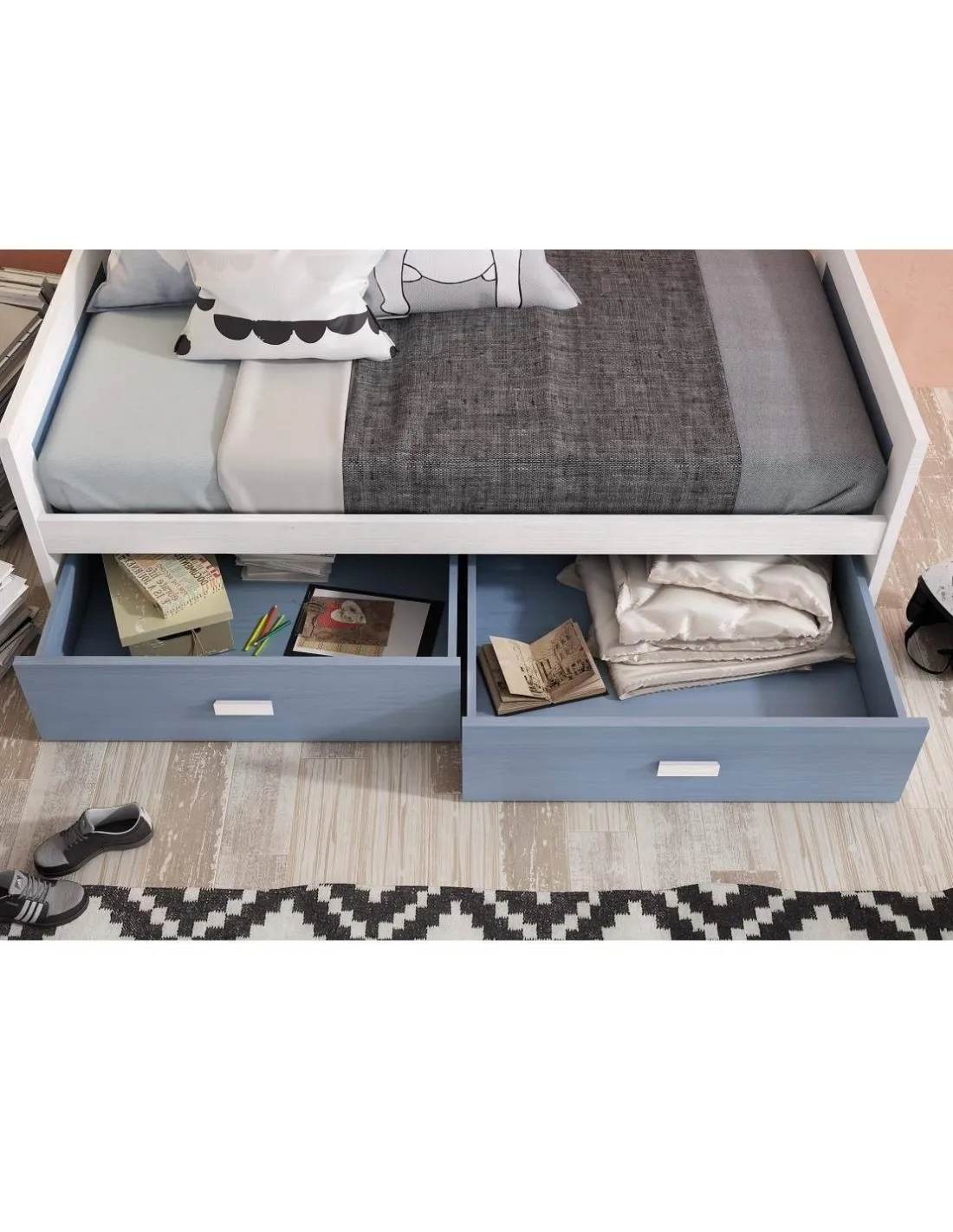 Se compone de cabecero, piecero, largueros y somier de lamas de madera para la cama superior. Para el nido se dispone un juego de dos cajones de gran capacidad y apertura con guía metálica de deslizamiento suave, fabricados también en madera de pino maciza.