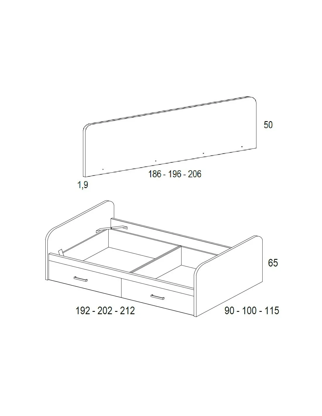 - Cama: 192 / 202 / 212 (colchón 180 / 190 / 200) x 90 / 100 / 115 (colchón 80 / 90 / 105) x 65 (altura base cama superior 40 cm. aproximadamente)