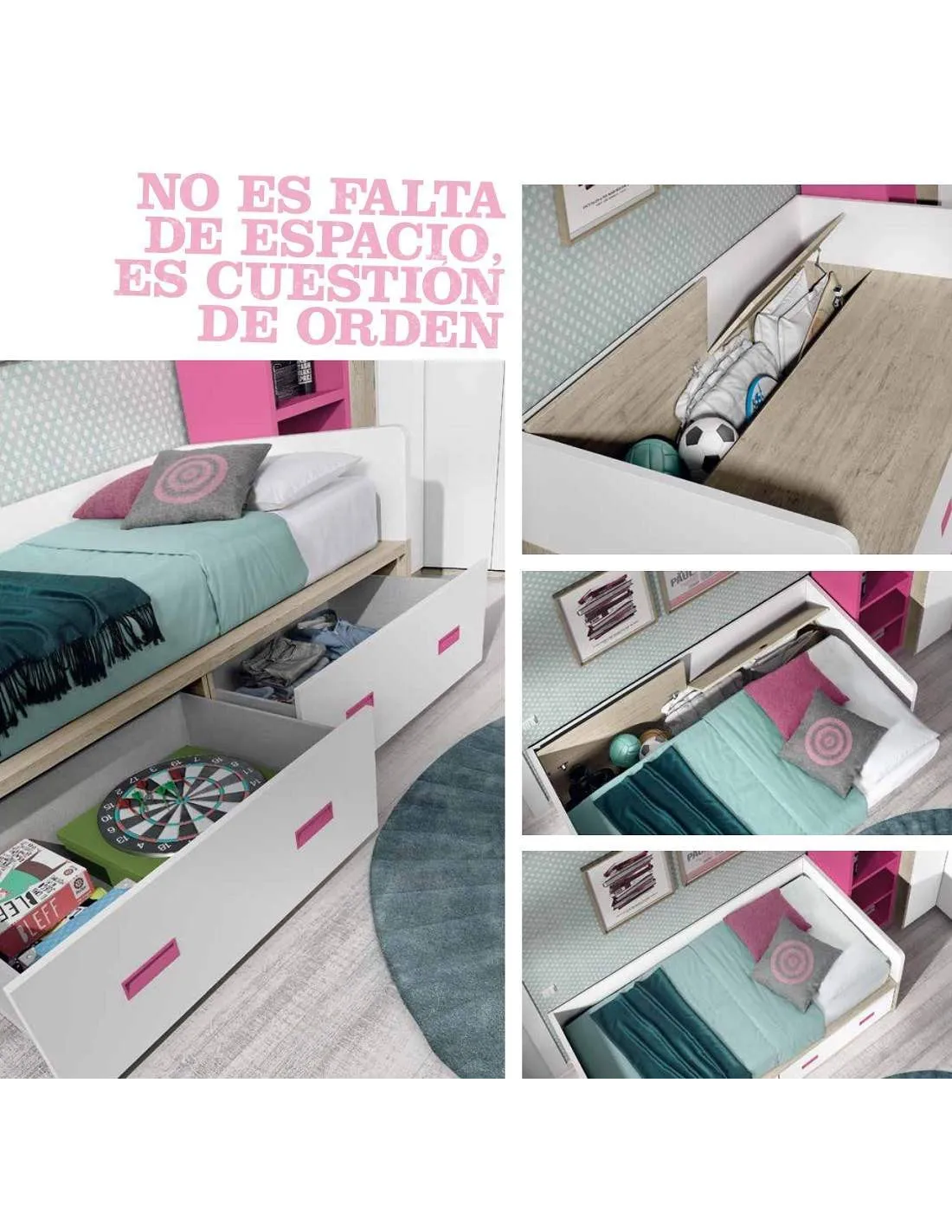Cama juvenil con dos contenedores de gran capacidad y guías de cierre automático