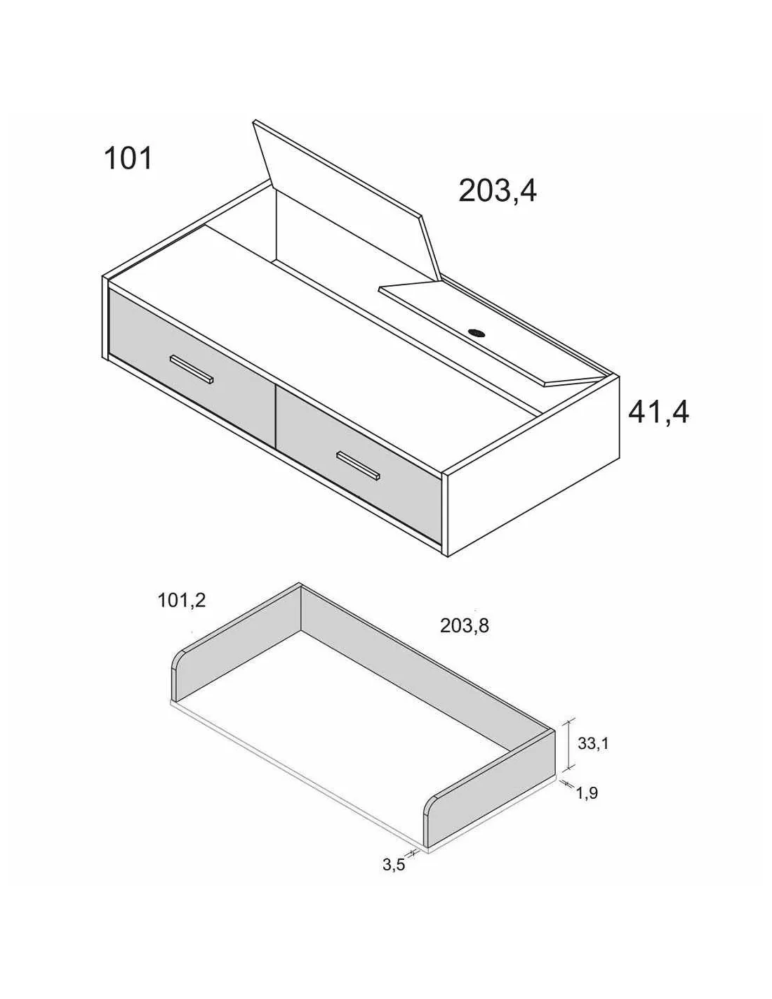 Esta cama nido con cajones se compone de la cama block nido de 2 contenedores de gran capacidad y acceso trasero al canapé oculto. Sobre este block nido se añade los brazos y la trasera del colchón. Presenta las siguientes medidas totales: