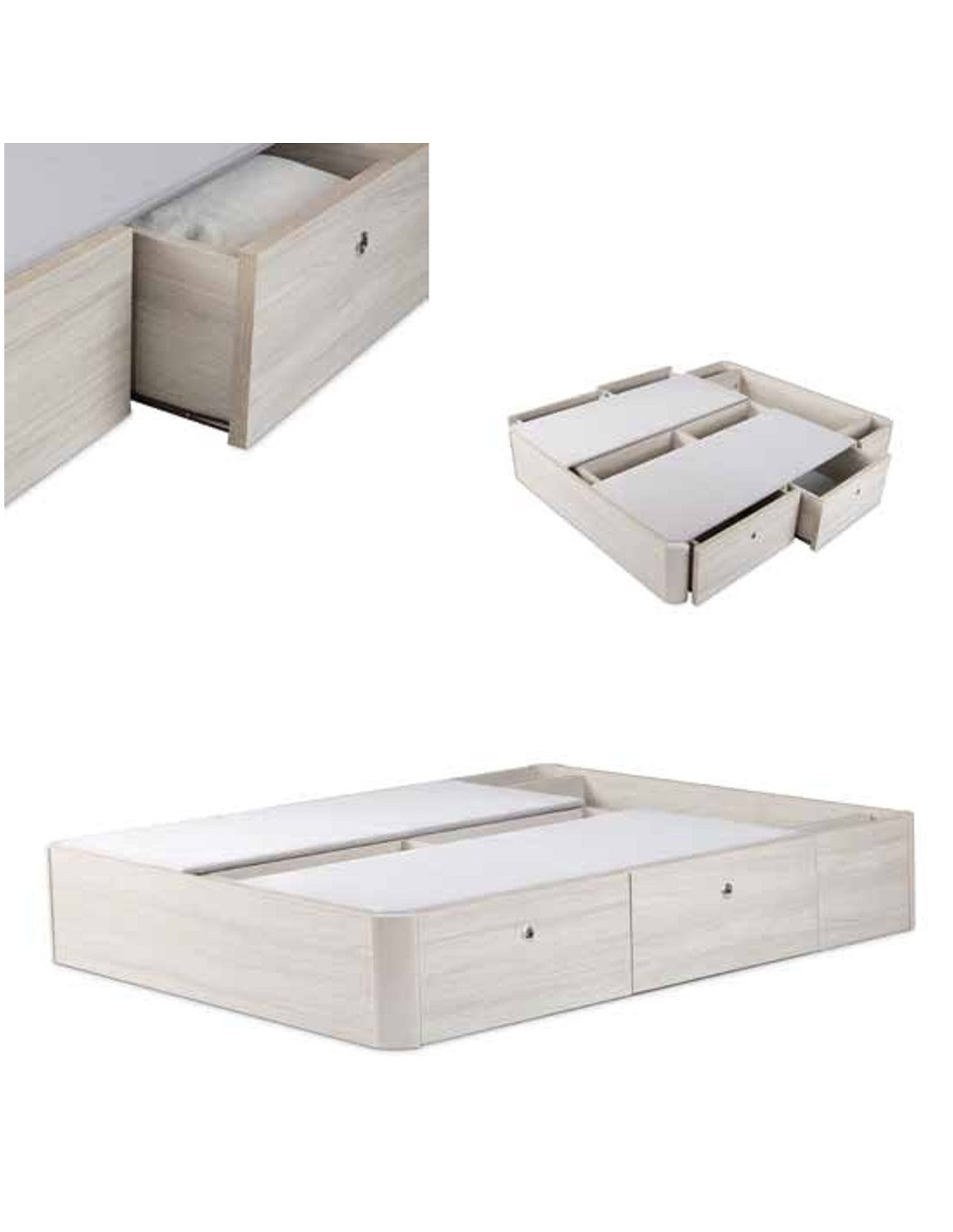 4. No tiene tapa convencional. Tapa 16 DM tapizada en 3D transpirable a juego. Dispone de varias tapas individuales, dos de las cuales se pueden retirar para acceder al hueco útil en la parte del cabecero y la parte central.