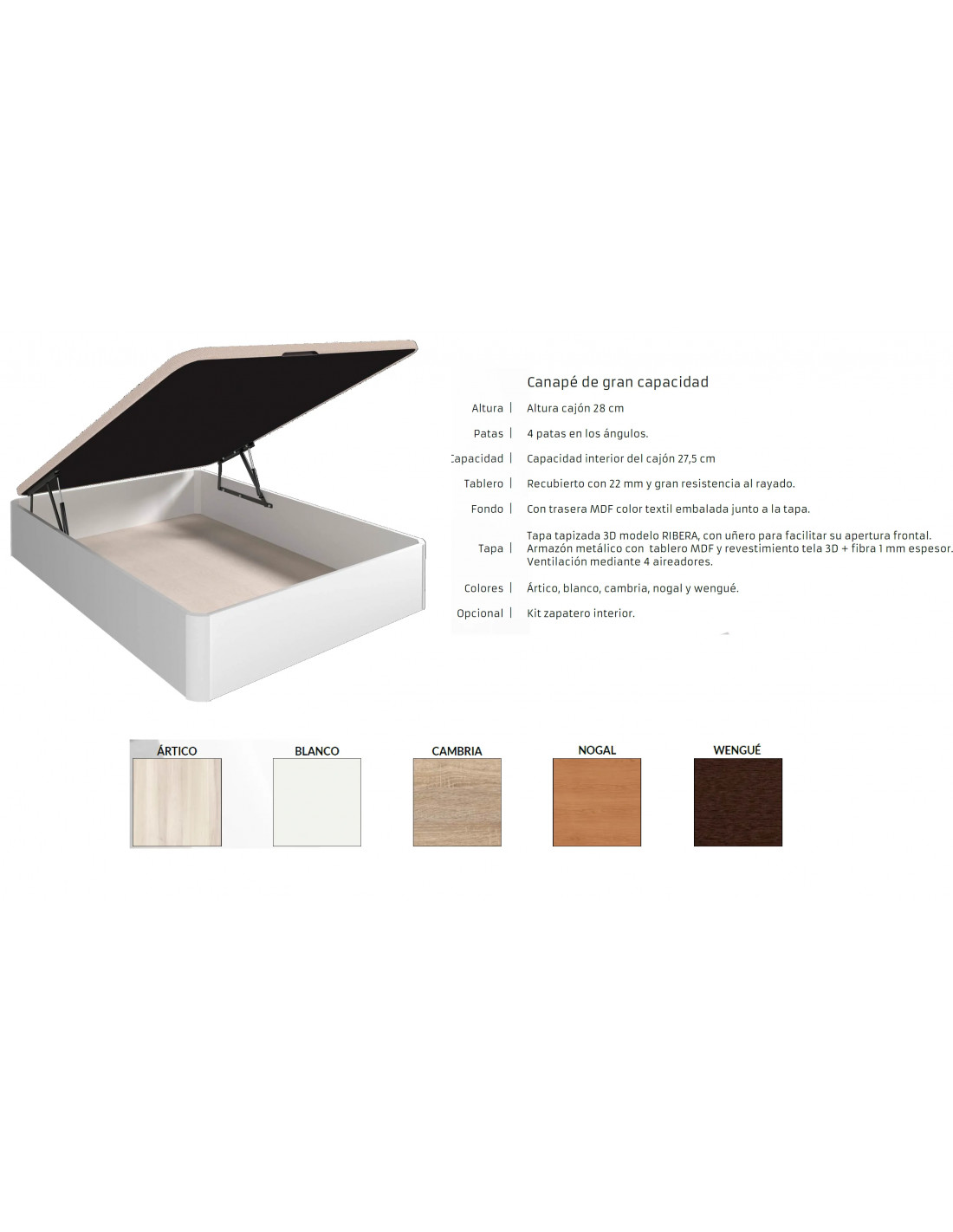 Este canapé Silver Oferta 22 está disponible en 3 colores de madera para el cajón (ártico, blanco, cambrian, nogal y wengué) con la base tapizada beige.