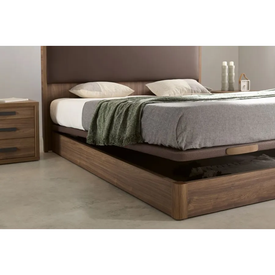 El somier metálico de soporte cuenta con refuerzos transversales y longitudinales además del arco metálico. Estos refuerzos evitan deformaciones de la tapa con lo que conseguimos un canapé más duradera. Además, vienen acabadas con tiradores de madera maciza a juego con el resto del canapé.