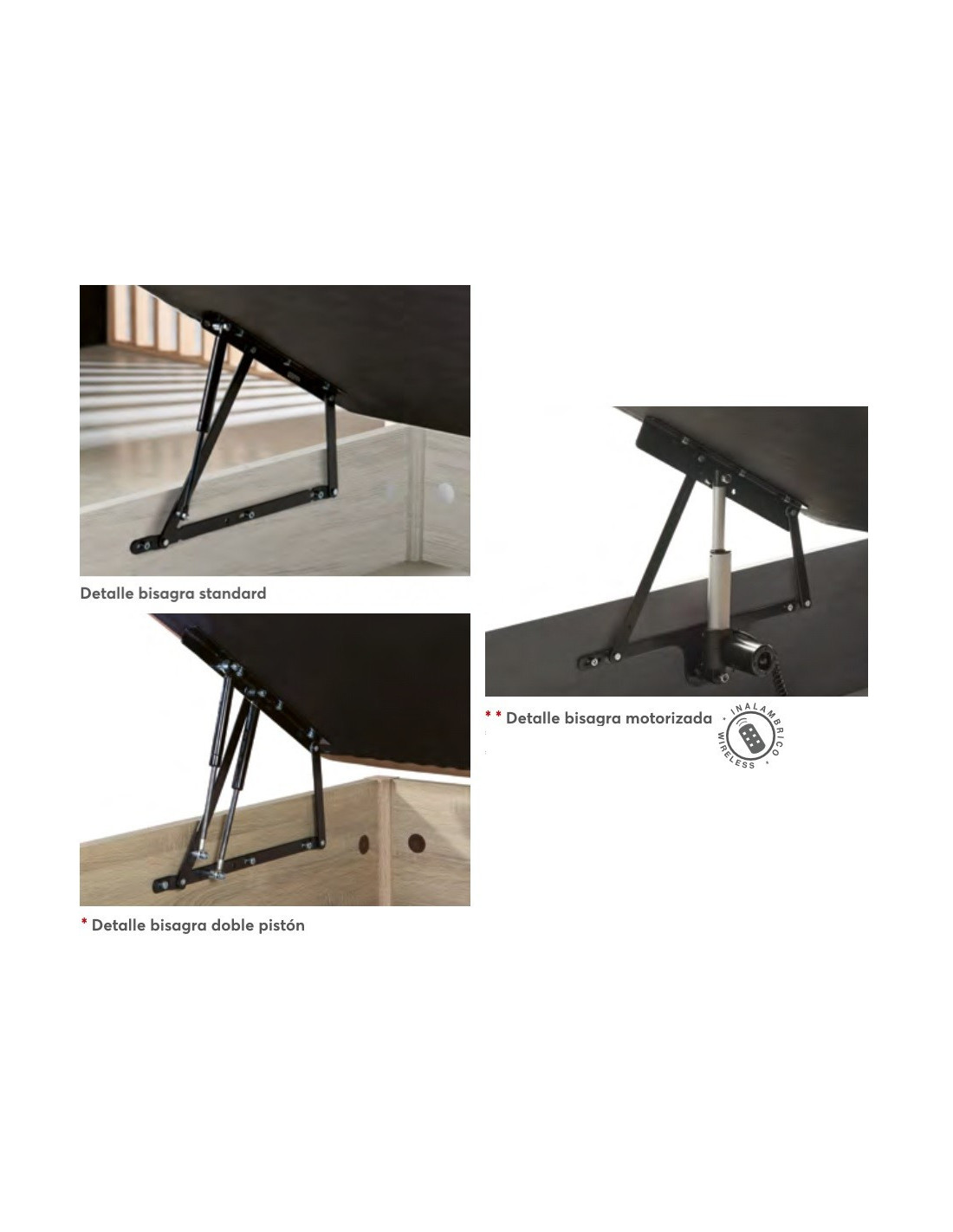 El somier metálico de soporte cuenta con tres refuerzos longitudinales además del arco todo ellos en bastidor metálico de alta resistencia. Además cuenta con refuerzos extra en la zona de las bisagras, que evitan deformaciones de la tapa con lo que conseguimos un canapé más duradera.