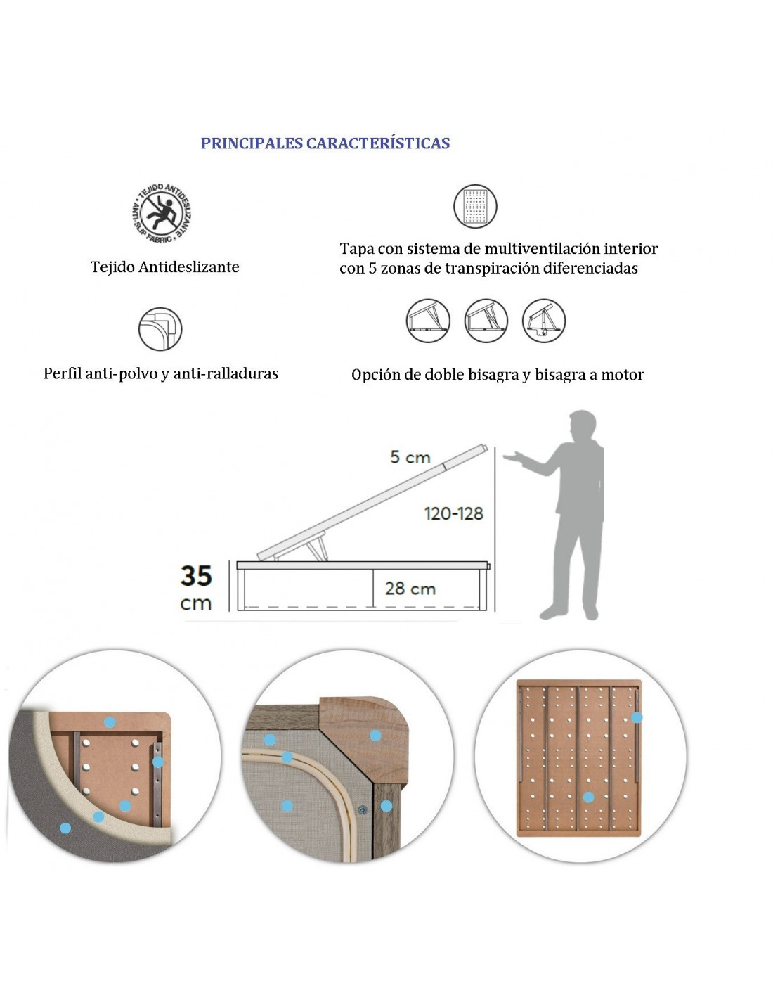 Su base de cajón de 12mm. es resistente y duradera. Además de su capacidad de soporte de peso, este fondo aporta un extra de firmeza al conjunto ya que viene atornillada a todo el contorno. Al suelo lleva un perfil de silicona antipolvo que evita que se acumule suciedad; opcionalmente se le puede cambiar este perfil por bases deslizantes para facilitar la movilidad del canapé sobre el suelo.
