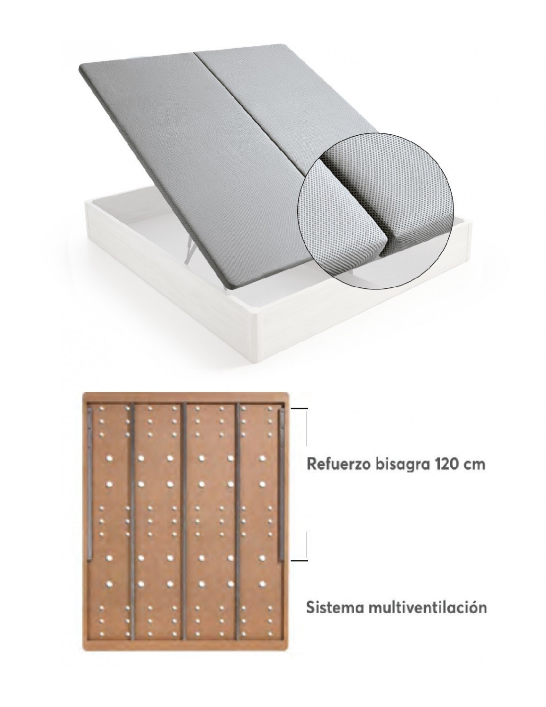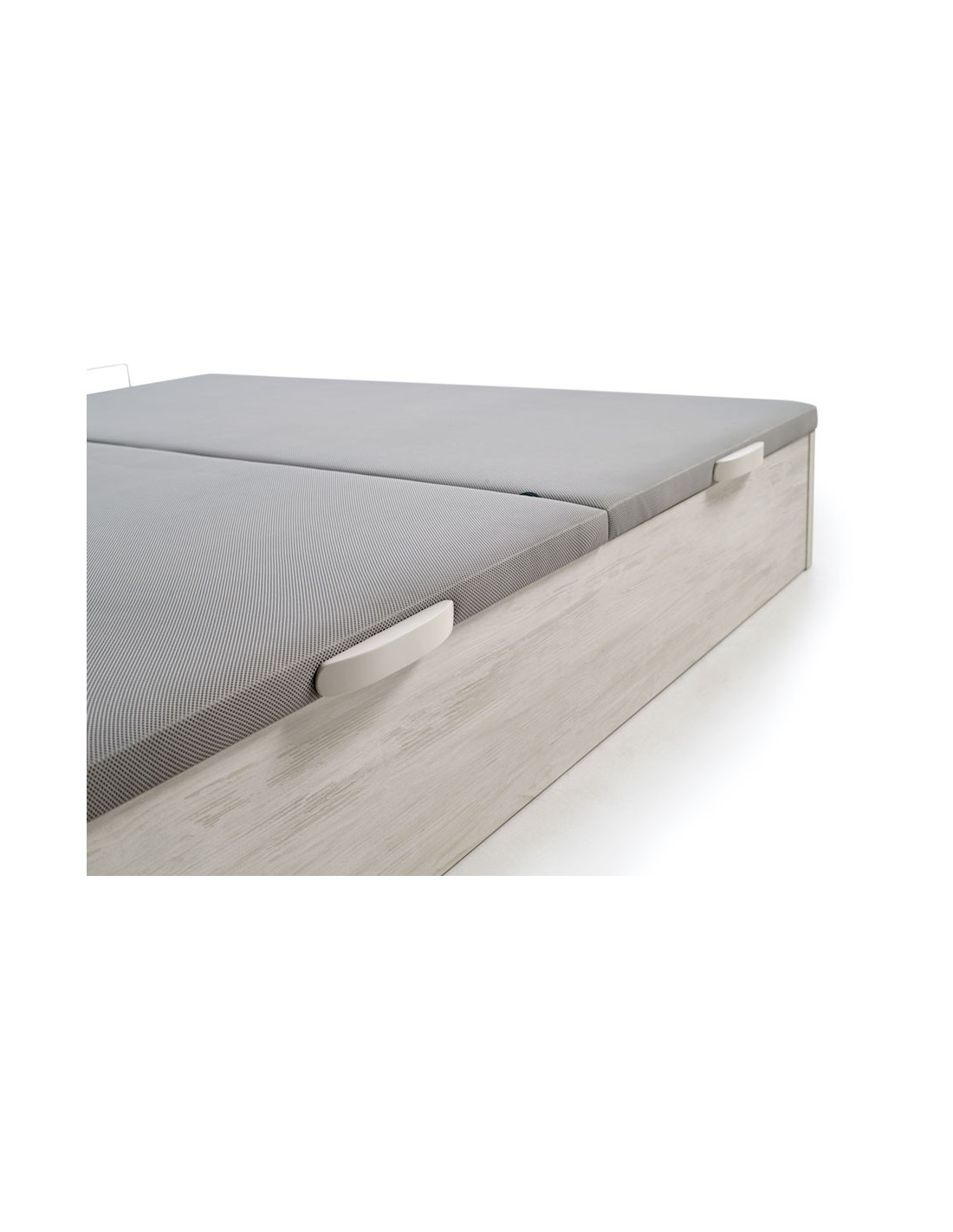 El somier metálico de soporte cuenta con refuerzos transversales y longitudinales además del arco metálico. Estos refuerzos evitan deformaciones de la tapa con lo que conseguimos un canapé más duradera. Además, vienen acabadas con tiradores de madera maciza a juego con el resto del canapé.