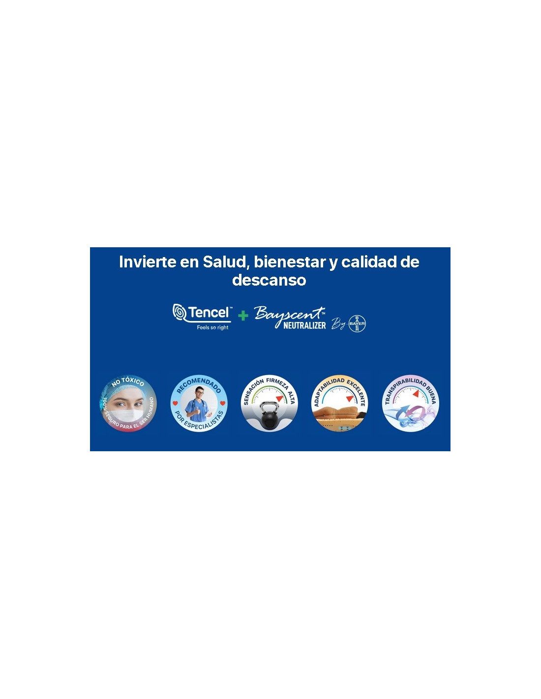 Funda bioelástica con tejido de alta tecnología TENCEL™ y acolchado en su parte superior de viscoelástica ViscoMind® de 2cm. de altura, con 65 Kg/m³ de densidad y firmeza de 1.9 kPa. Hilo de plata antimicrobiano. Funda totalmente desenfundable con doble cremallera oculta y lavable. La funda Tencel™ es más absorbente que el algodón, más suave que la seda y mejor que el lino. Neutraliza los malos olores gracias al tratamiento Bayscent™.