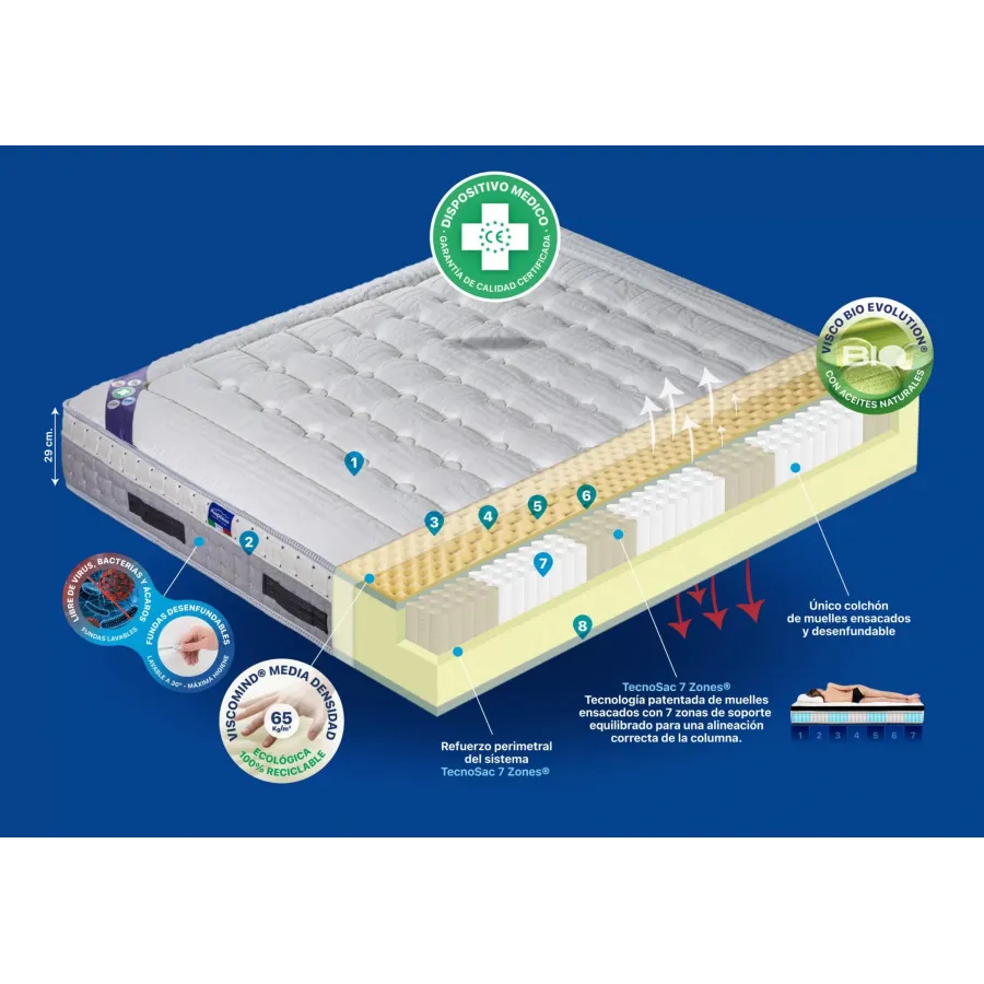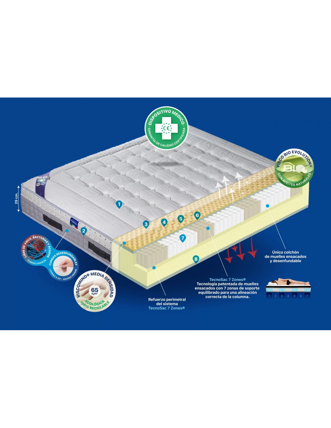 Núcleo de muelles ensacados TecnoSac 7 Zones® (1.500 muelles en cama doble / 900 muelles en cama simple) de 14 cm. de altura, distribuidos en 7 zonas de descanso, mediante muelles con alambres de diferente diámetro.
