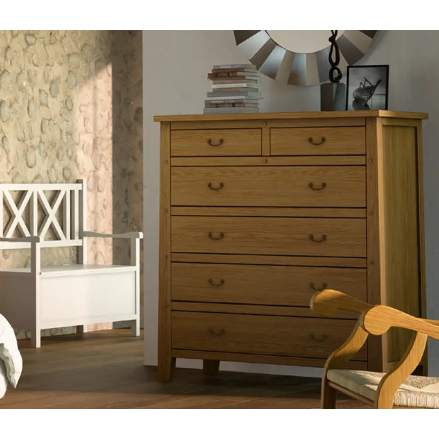 Mueble auxiliar fabricado en madera de pino. Hecho en España. Cómoda con seis cajones para dormitorio disponible en terminaciones barnizadAs, disponible para comprar solo la cómoda.