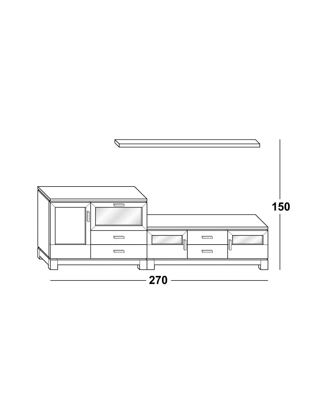Este mueble de salón 270 cm. tiene las siguientes medidas (alto x largo x fondo en cm.): 150 x 270 x 45.