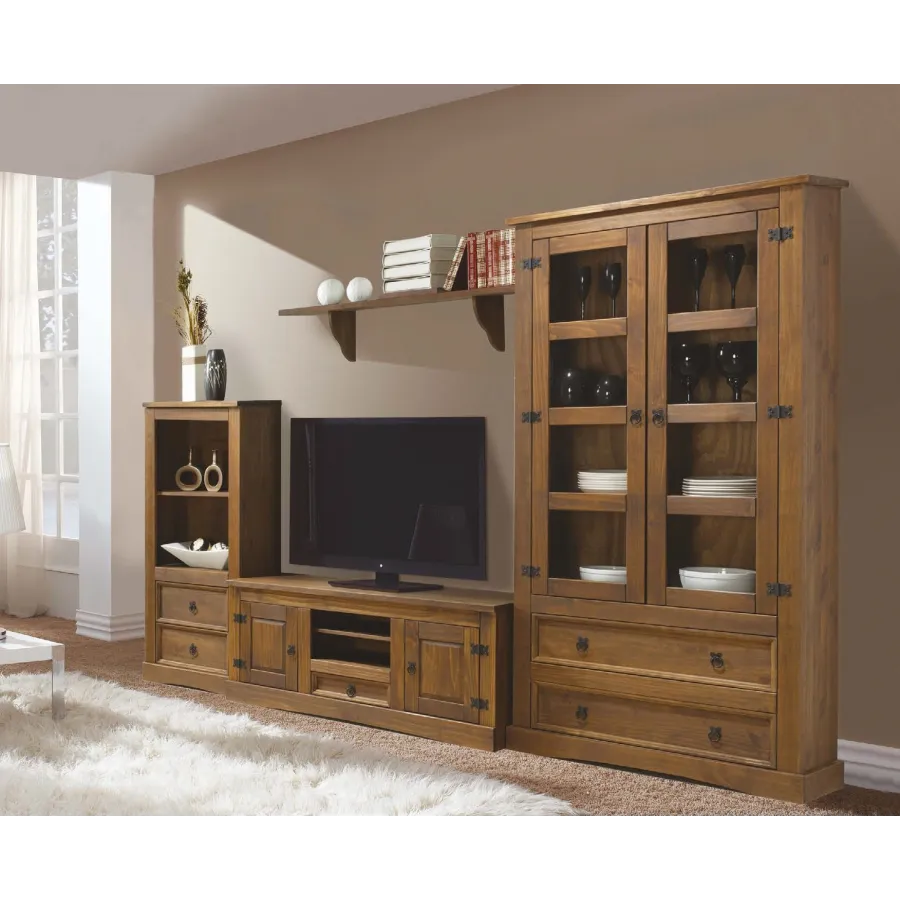 Mueble de salón colonial en madera maciza de pino color nogal oscuro encerado en formato kit