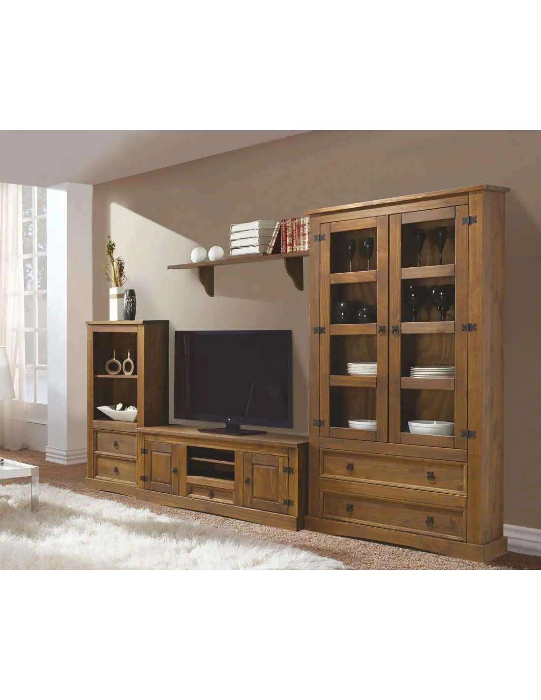 - Vitrina dos puertas dos cajones 100cm. + mueble tv 130cm. + librero bajo 60cm. + estante de pared