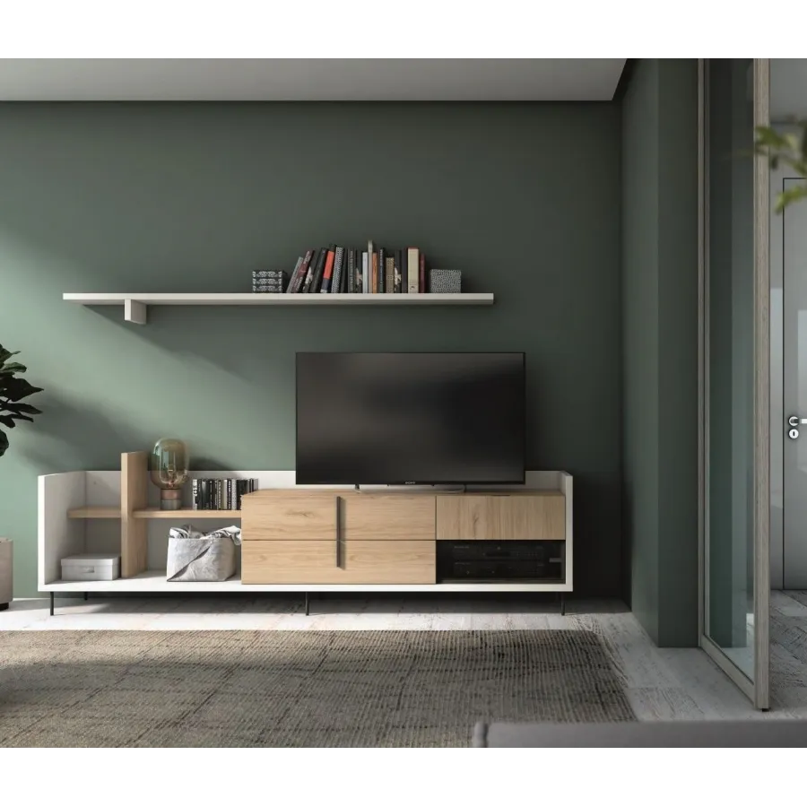 Este mueble de salón 802 viene con un largo total de 246 cm. La altura es variable en función de la colocación del múeble de pared. Cada uno de sus módulos cuentan con las siguientes medidas en largo x alto x fondo (en cm.):