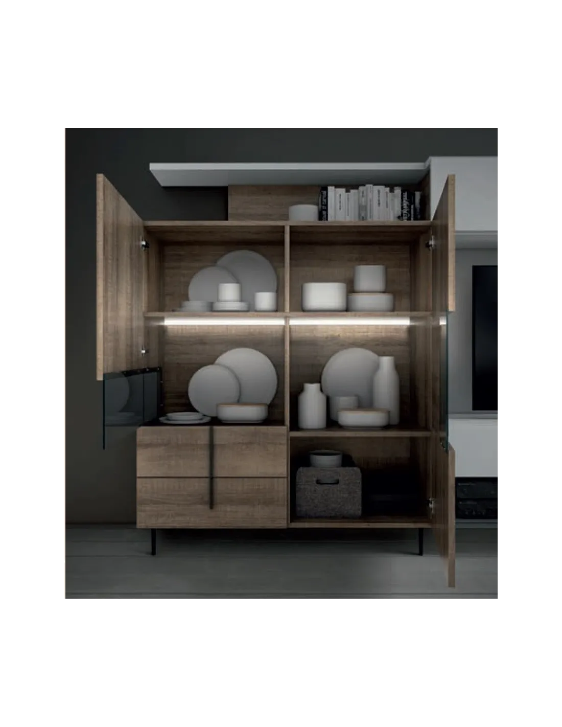 Tenemos opciones de catálogo que no están incluidas en esta ficha de producto pero que se puede optar por configurar a su manera: tiradores, patas, medidas, módulos independientes, posiciones de puertas...