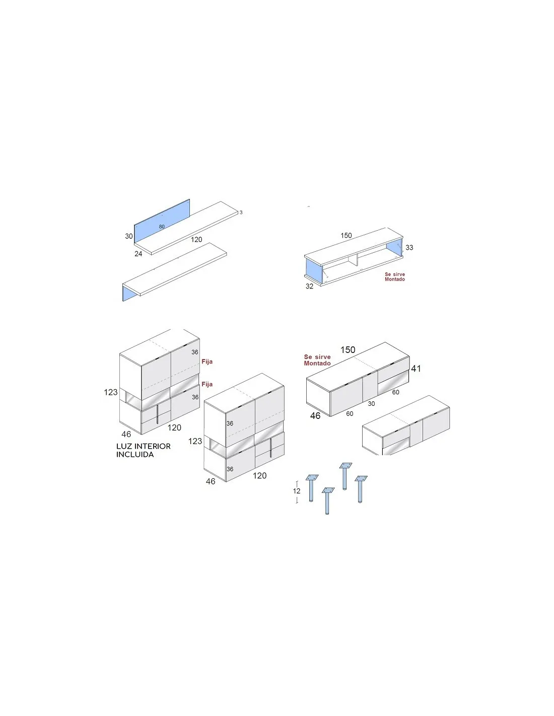 - Módulo de tres puertas con cristal y patas: 150 x 53 x 46 cm.