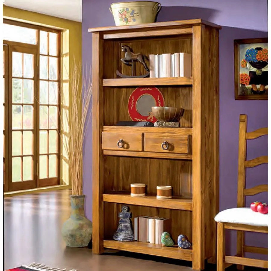 Librero estantería de dos cajones en madera maciza de pino estilo mexicano.