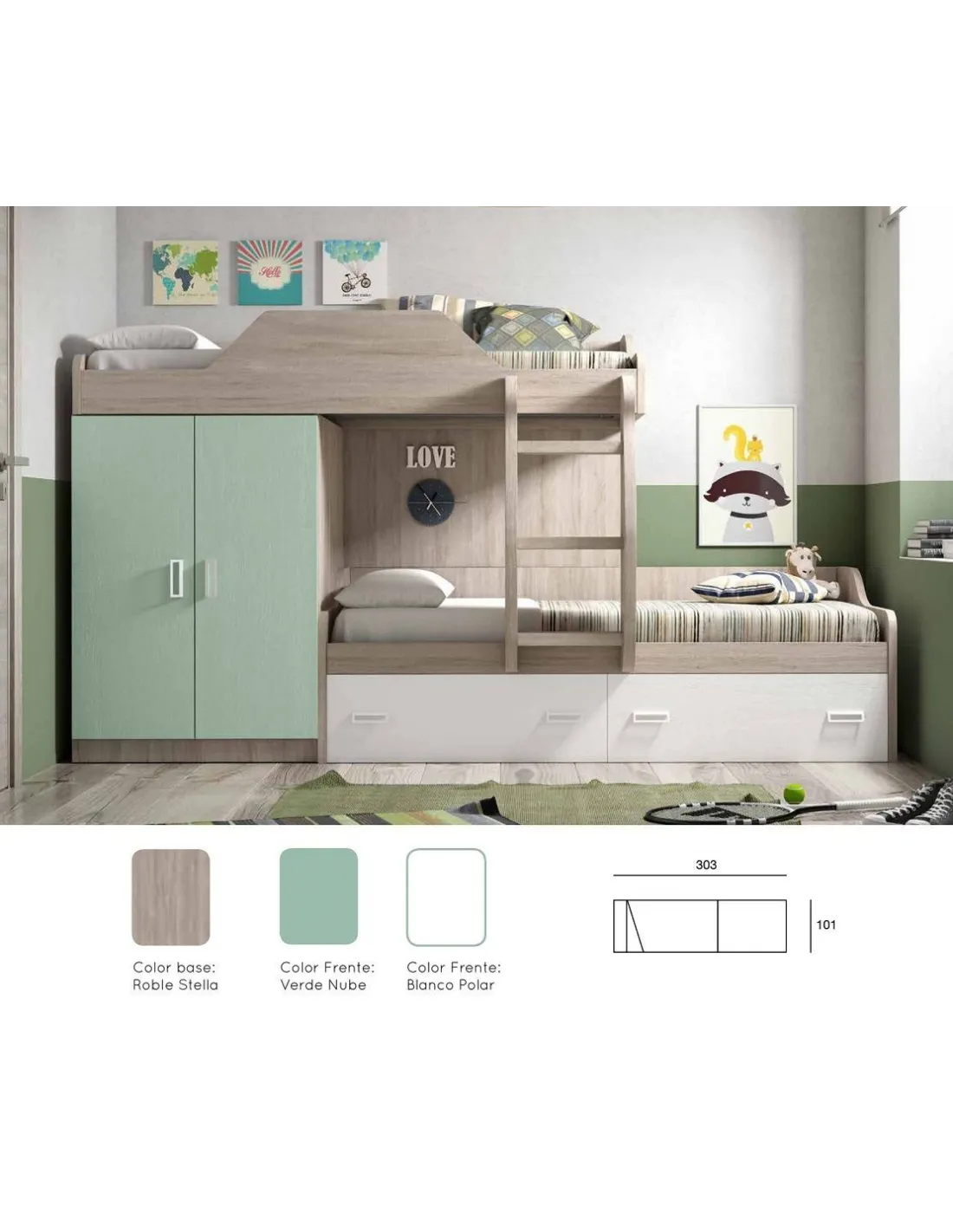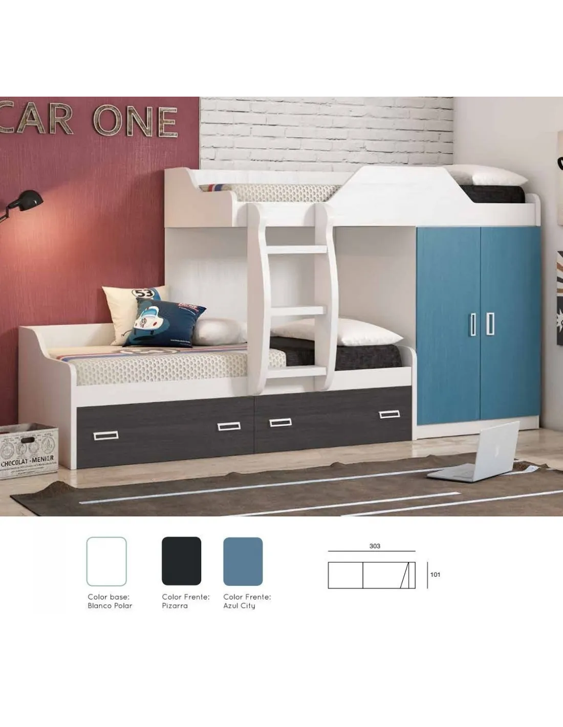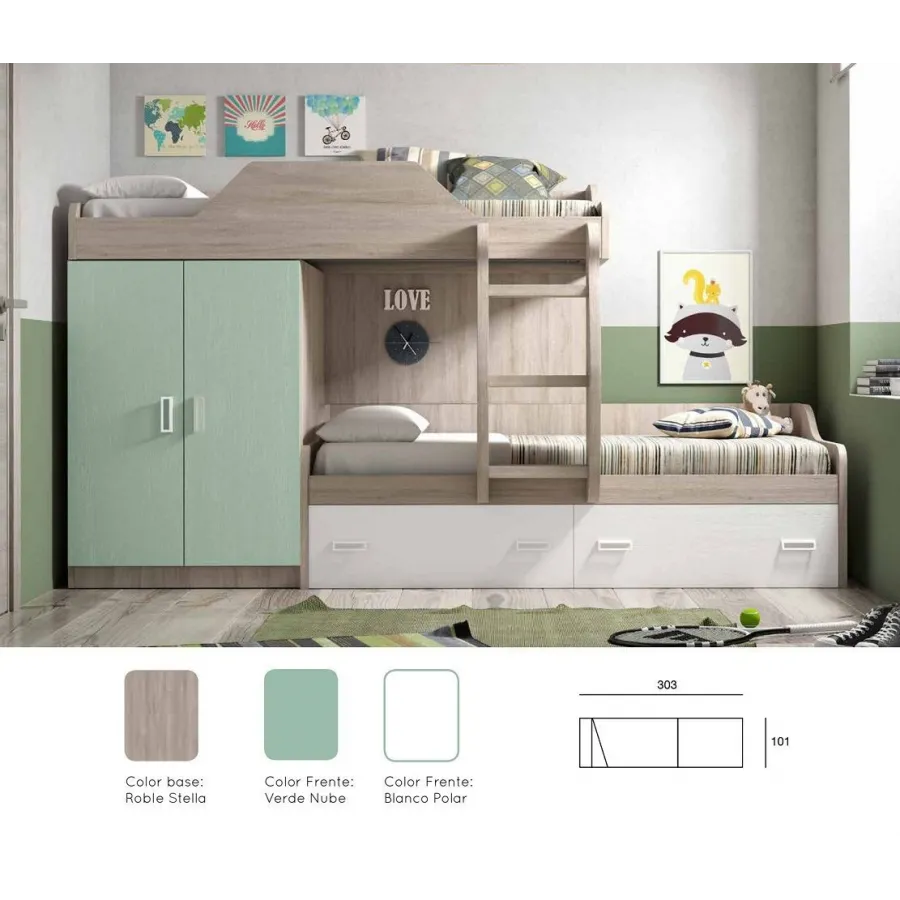 Esta cama tres con armario y cajones de gran capacidad viene preparada para dos camas de 90x190 cm. Incluye módulo de armario con dos puertas y cajones inferiores de nido de con guías metálicas de apertura suave. Tiene diez colores a elegir, con las siguientes medidas totales: