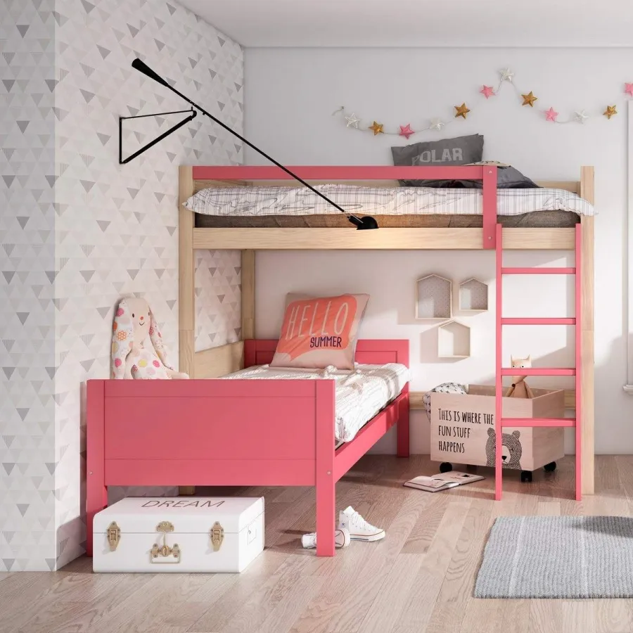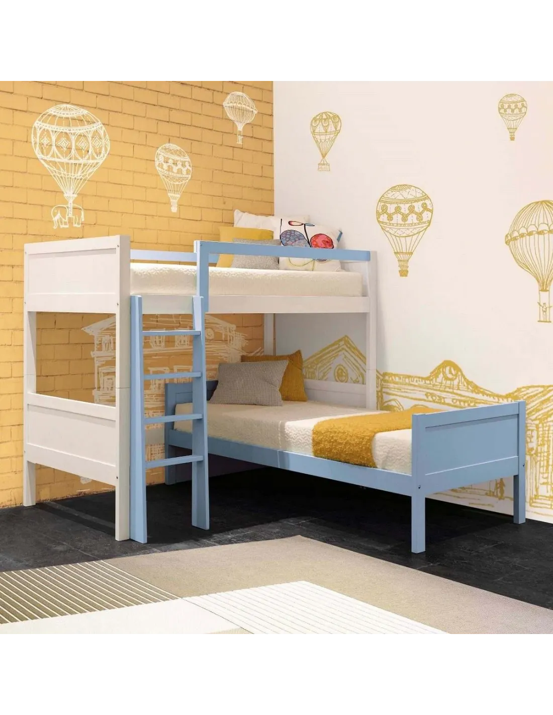Esta litera convertible L Plafón en esquina se puede personalizar en base a cuatro series de colores con terminaciones barnizadas, lacadas, decapés y glaseados.