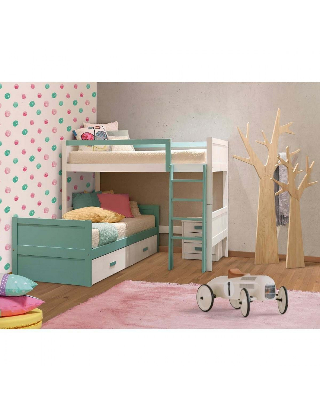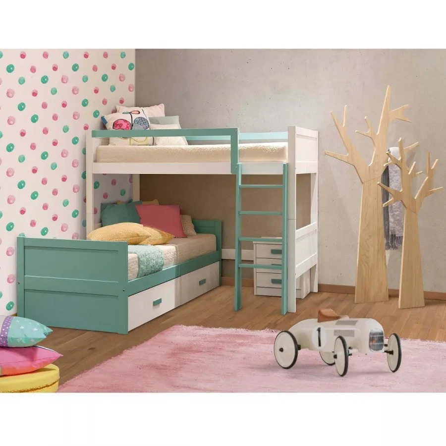 Litera L con nido de cajones guías fabricada en madera maciza