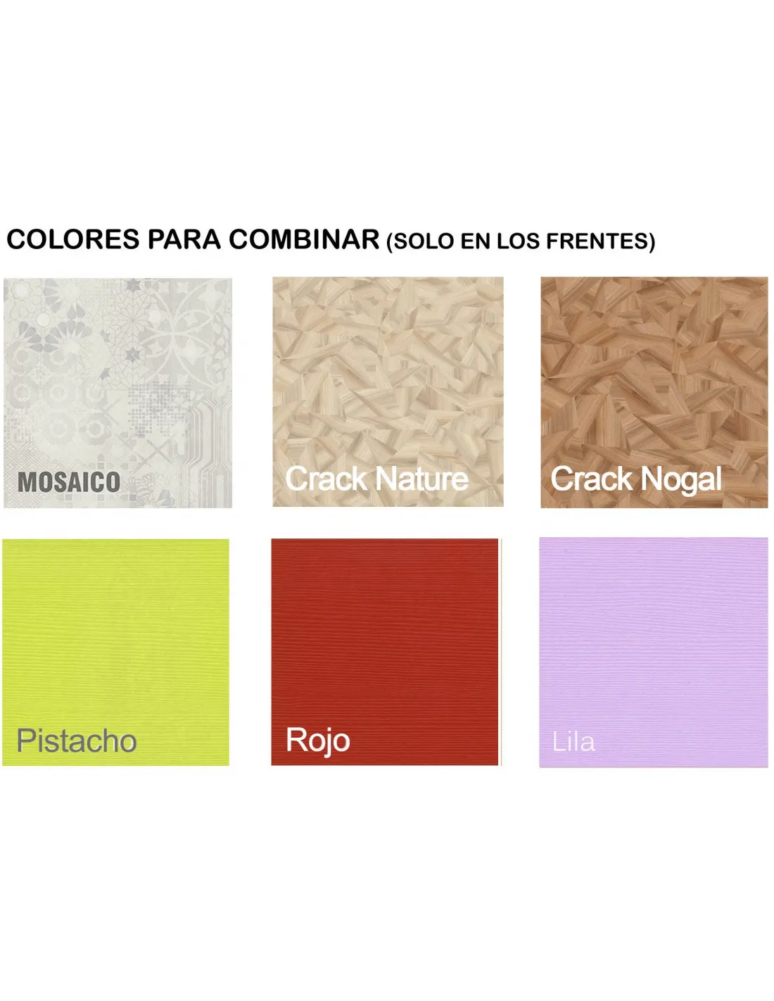 - Colores base: aplicables al cajón exterior, son los colores blanco - nórdico - antracita - cerezo - roble - chocolate - wengué - fresno - glacial - vintage - cemento - cambrian - ébano.
