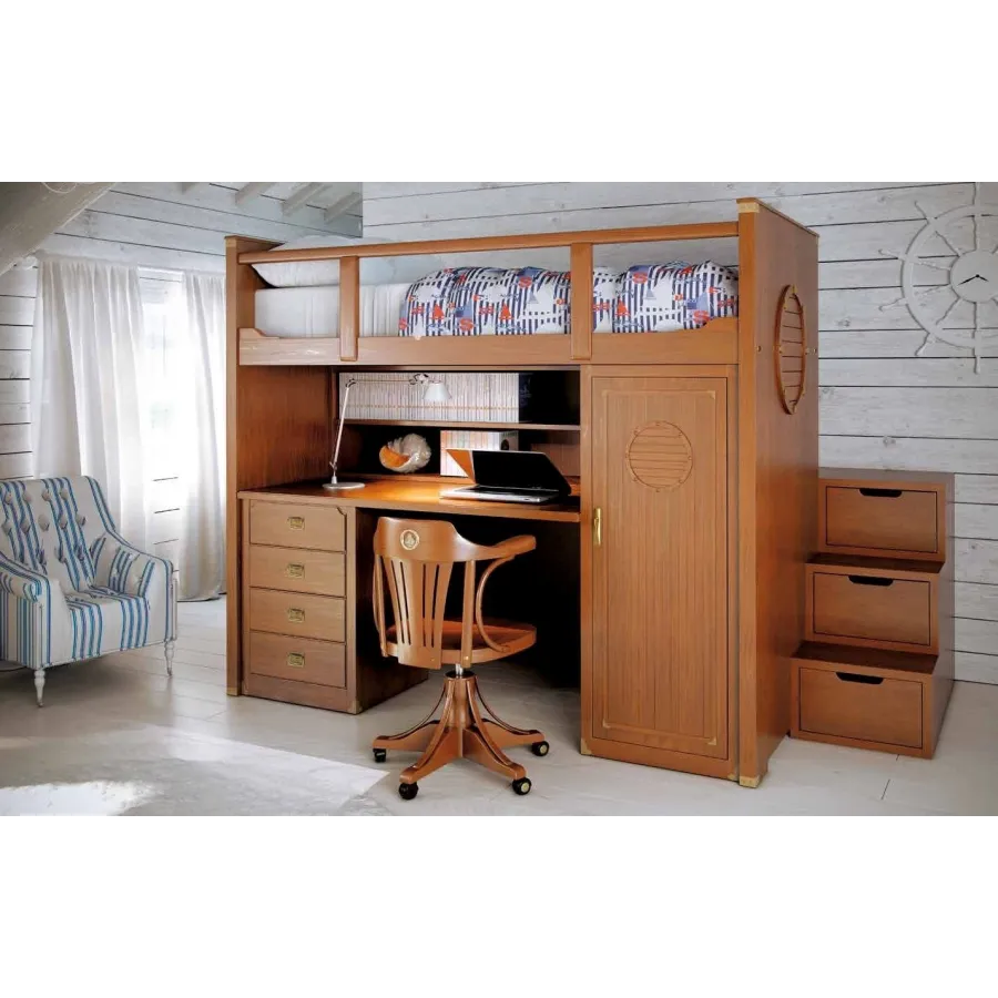 Litera colonial con escritorio, armario y acceso trasero con pasarela escalera de cajones