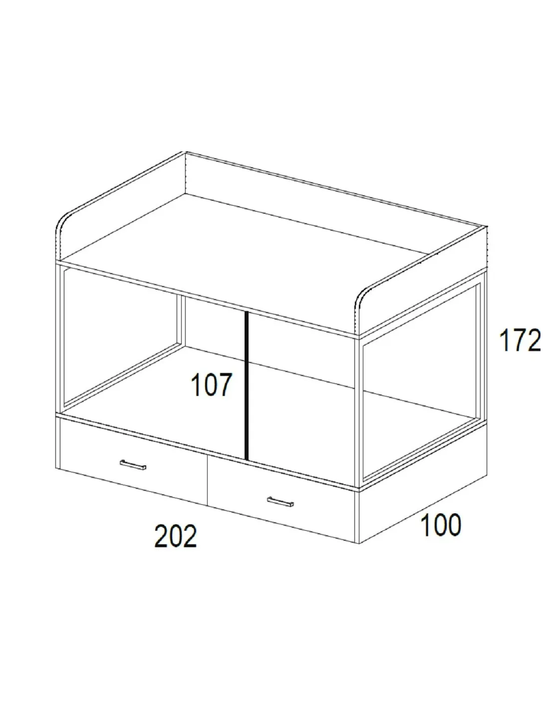 Esta litera soporte metálico con dos cajones de ruedas viene con un largo total de 202 cm. Viene preparada para colchones de 90x190 cm. Cada uno de sus módulos cuentan con las siguientes medidas en largo x alto x fondo: