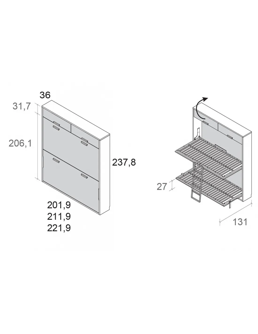 Esta cama abatible incluye dos camas abatibles individuales de 90 cm. con posibilidad de largo variable, el altillo y la escalera de subida. Las medidas totales de este mueble de litera abatibles con altillo son: