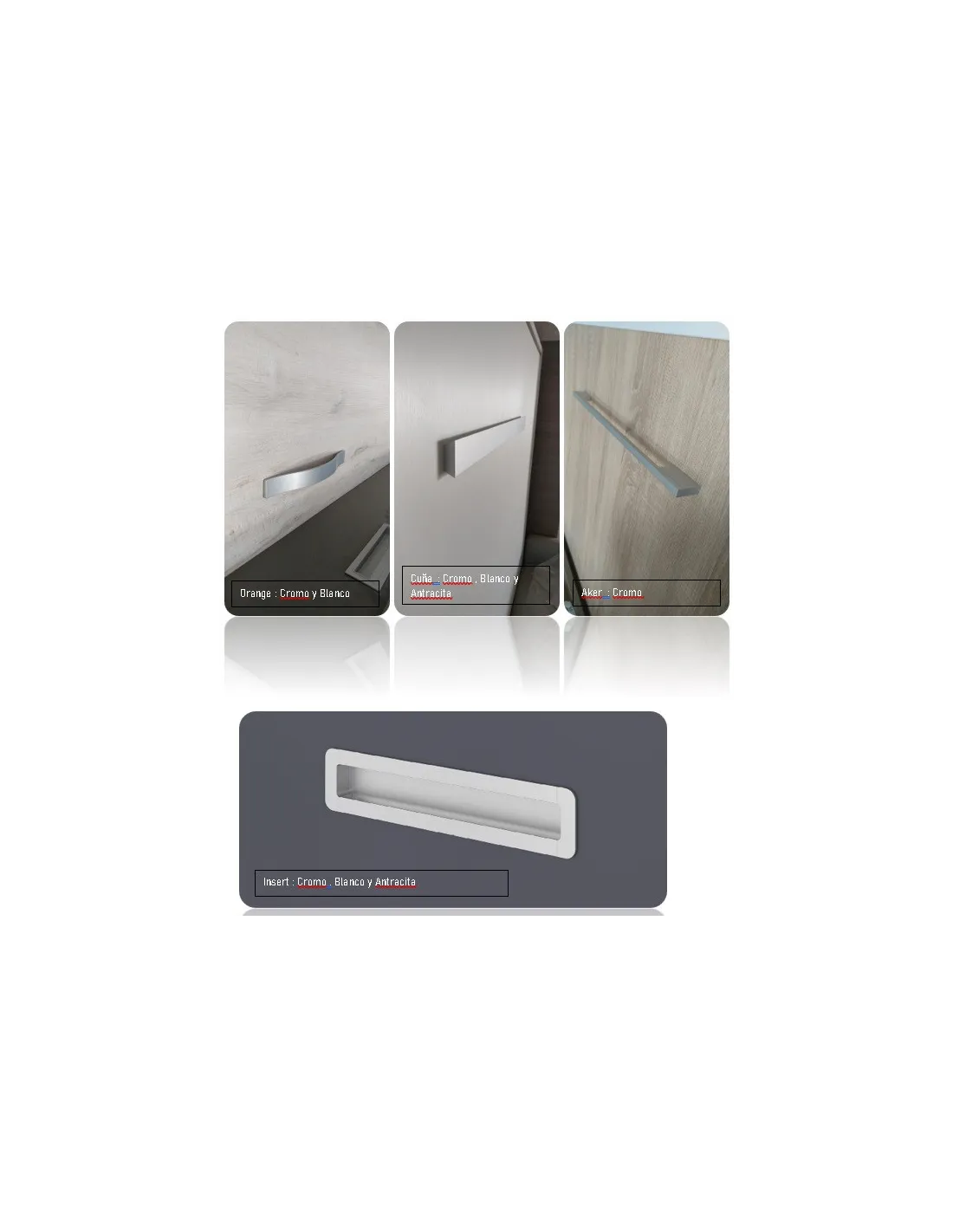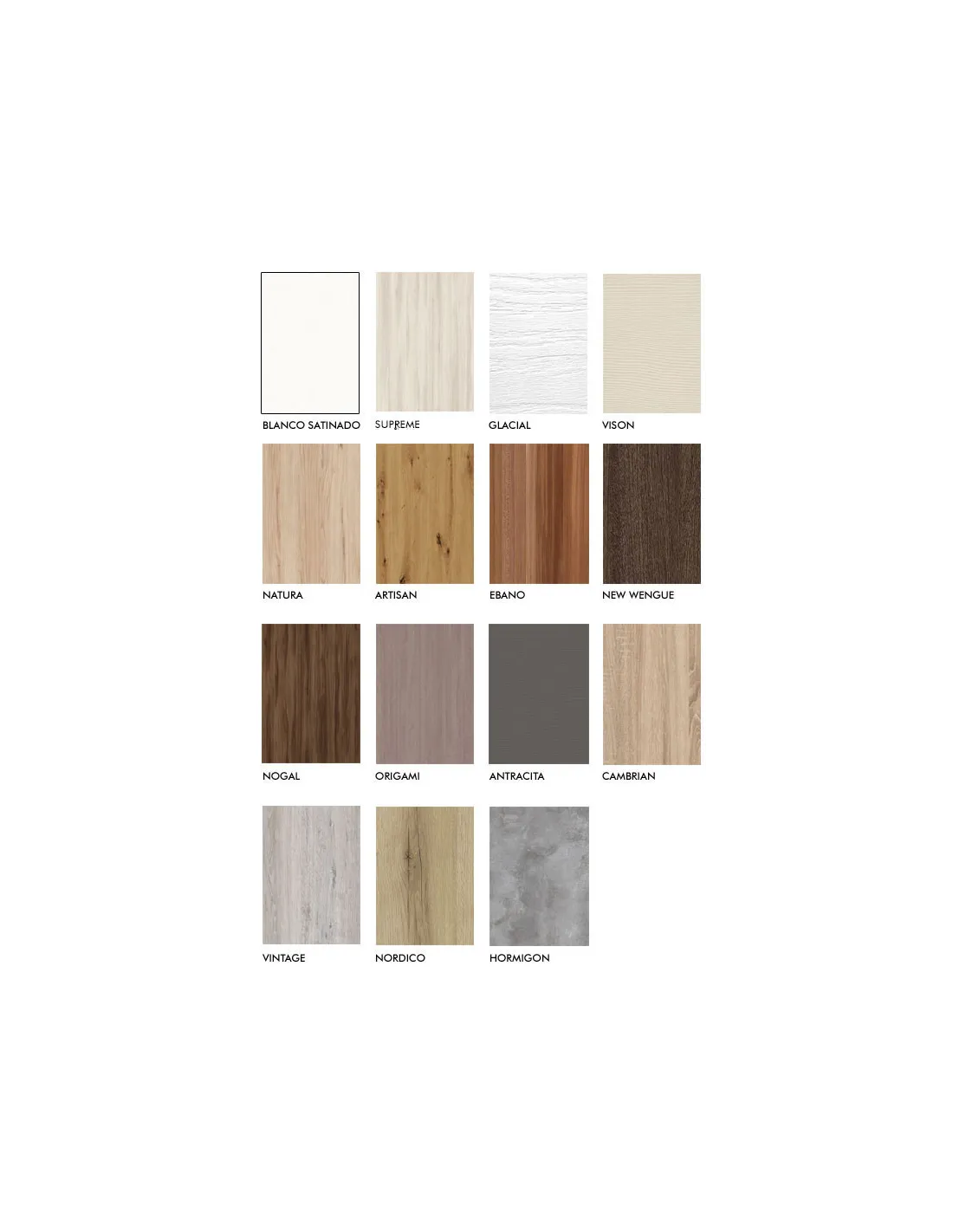 - Colores base: aplicables al cajón exterior, son los colores blanco - nórdico - antracita - cerezo - roble - chocolate - wengué - fresno - glacial - vintage - cemento - cambrian - ébano.