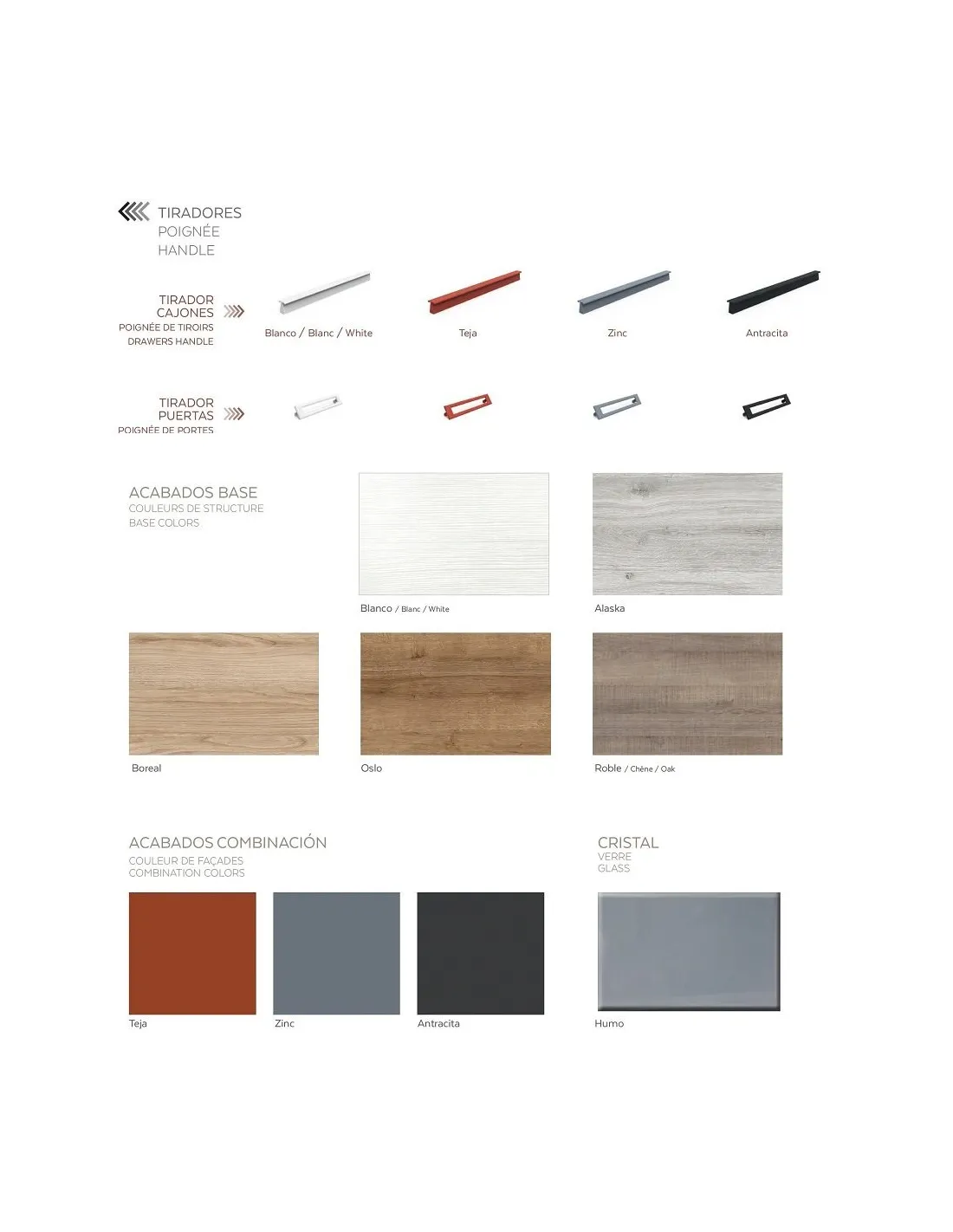 - Colores base: puede aplicarse a cualquier parte del mueble: armazón, frentes de puertas/cajones, bases y tiradores.