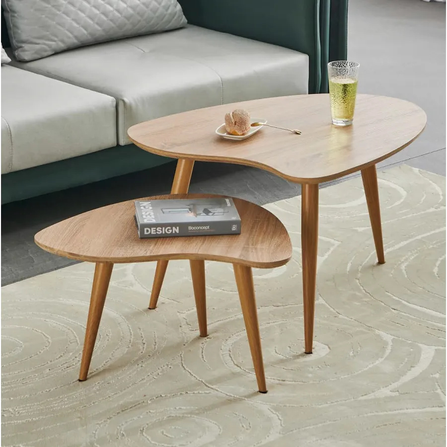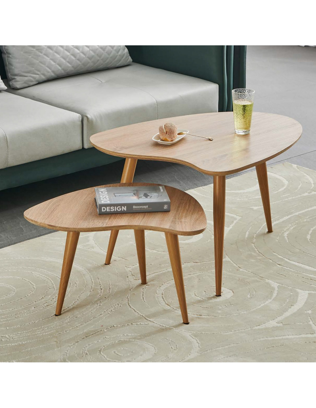 Este conjunto de mesas cuenta con las pata en madera maciza sobre a que se dispone la tapa de melamina roble.